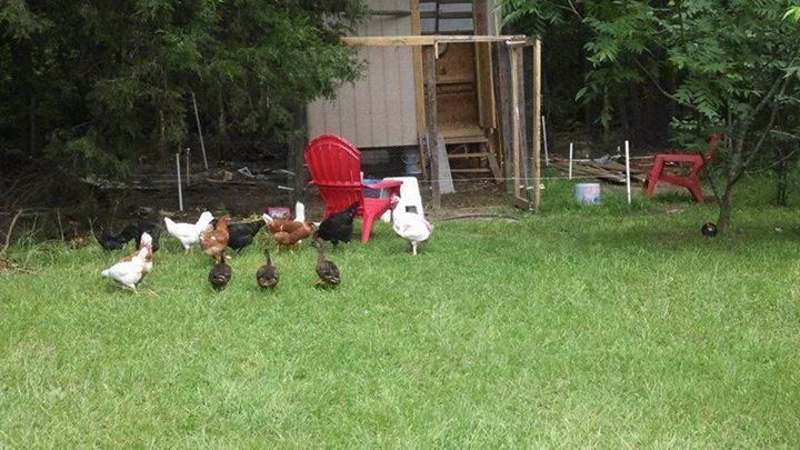 This is a picture of my coop with the chickens free ranging. The large Eastern Red Cedar is Southwest of the coop so it provides afternoon shade and allows sun in the mornings. We enjoy sitting in the chairs, watching the chickens and feeding them some treats. I looked at many of the coops on this site and built it by ear starting with a heavy sheet of plywood and some 4X4s. I plan to cut a pop door so I can close the big door this winter. I like the nest box built on the side with an exterior lid accessable from outside of the coop. I have learned to count hens before opening the door. Some of the hens have scolded me for invading their privacy when they were on the nest.