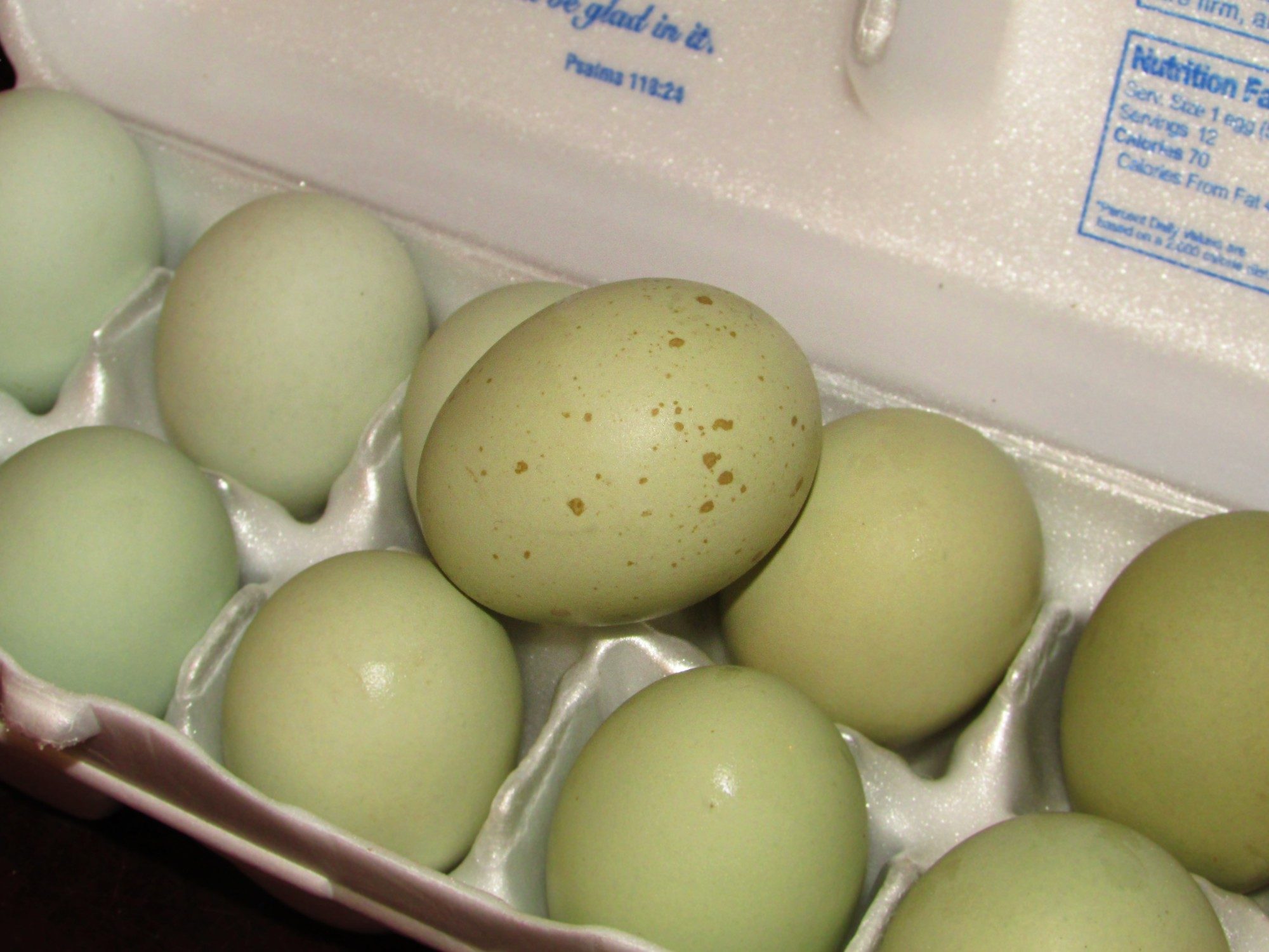 Here are some eggs that my Marans/Ameraucana crosses are laying now. They range quite a bit from light green to olive and the only way to now for sure who laid the egg was to watch the chicken push it out LOL. I have an easter egger that lays the exact same shade of green as some of my half Marans girls. It's crazy, but it all depends on how many and which of the 13 brown egg genes they get from their Marans parent. A hint.... if you want a more intense olive color layer, cross one of the half breed chicks back to Marans (it can be the chick's parent) and about half of the chicks should give you that awesome olive green shade.