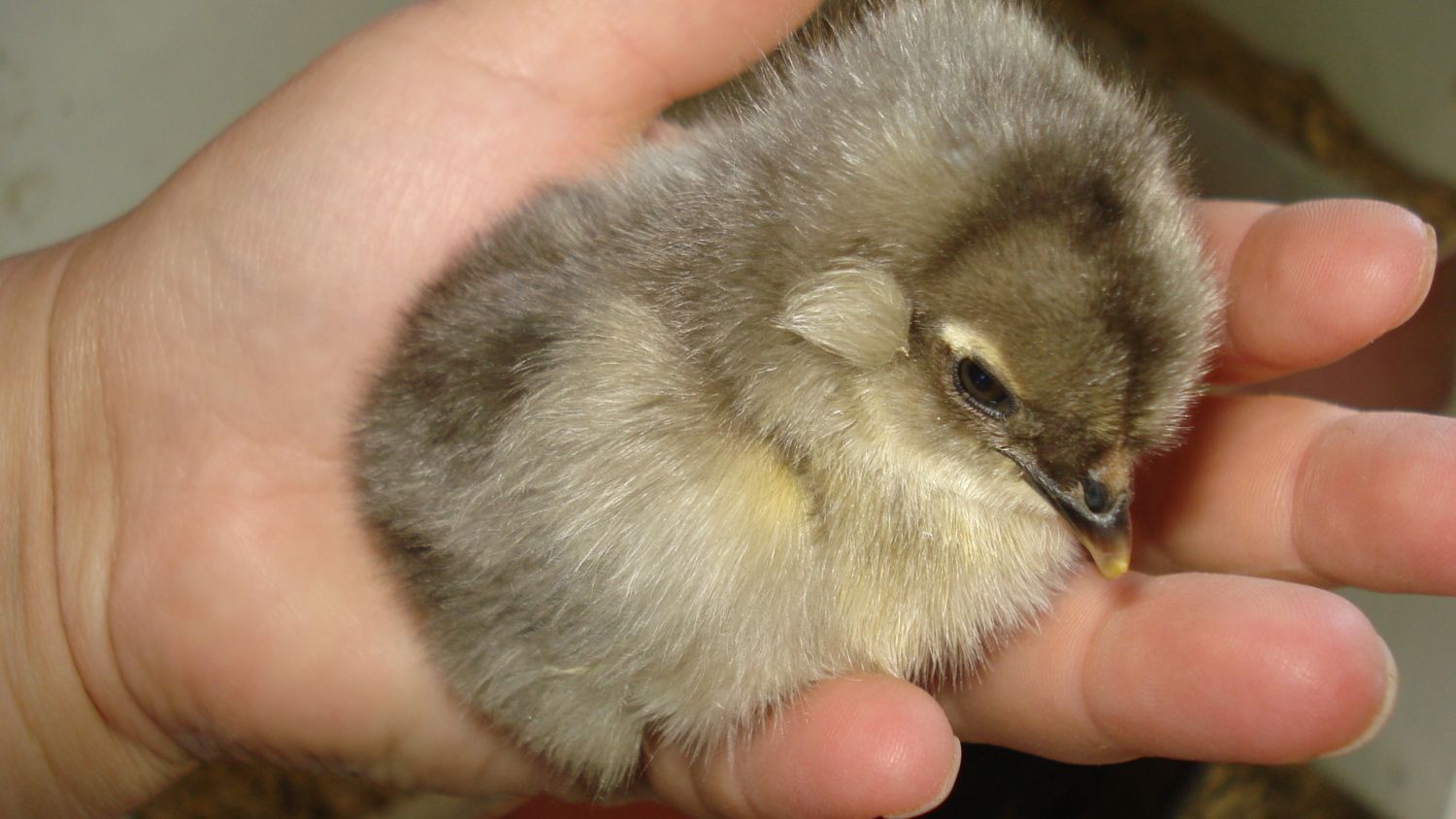 This is my most recent olive egger chick! Araucana x Black Copper marans. Obviously the chick is gonna grow up to be a pretty blue chicken, since the dad was a splash Araucana and the mother the BCM. The chick is double tufted and has a tail, plus fuzzy legs!