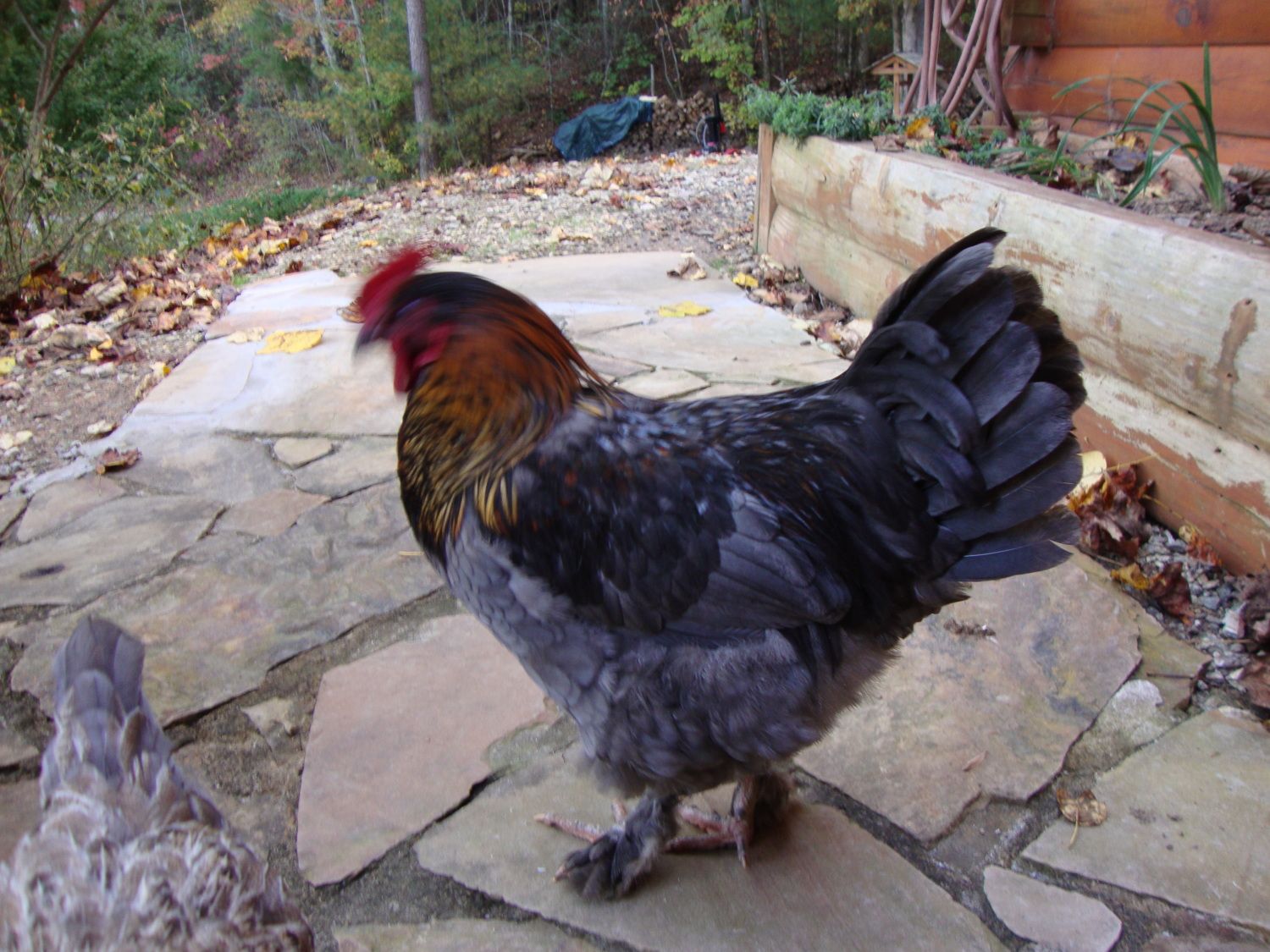 So here is my 3rd generation OE roo.  What do you think of his looks? He is 7 months old.  Sorry about the blurry pics.  He was chasing raisins my husband was throwing to him.  Just thought I would share the pics.  He was suppose to be a she...   wonder what color eggs his chicks would have if I breed him with brown or blue egg layers.  I wonder if he has any of the blue genes in him.  He has a straight comb, so probably not.  oh well....I am an EE hen.