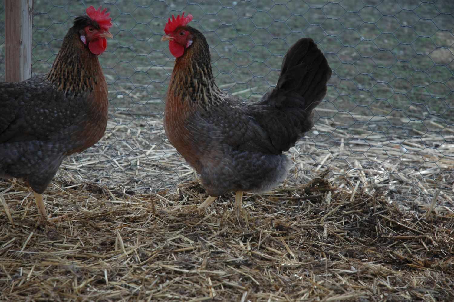 Then I bought three barred rock pullets(one turned out to be a little cockrel) a black & a white pullets that are about six mo. old. Now I have finally found two young EE Roo's that are good boys & my girls love them. (Even the old hens!!)