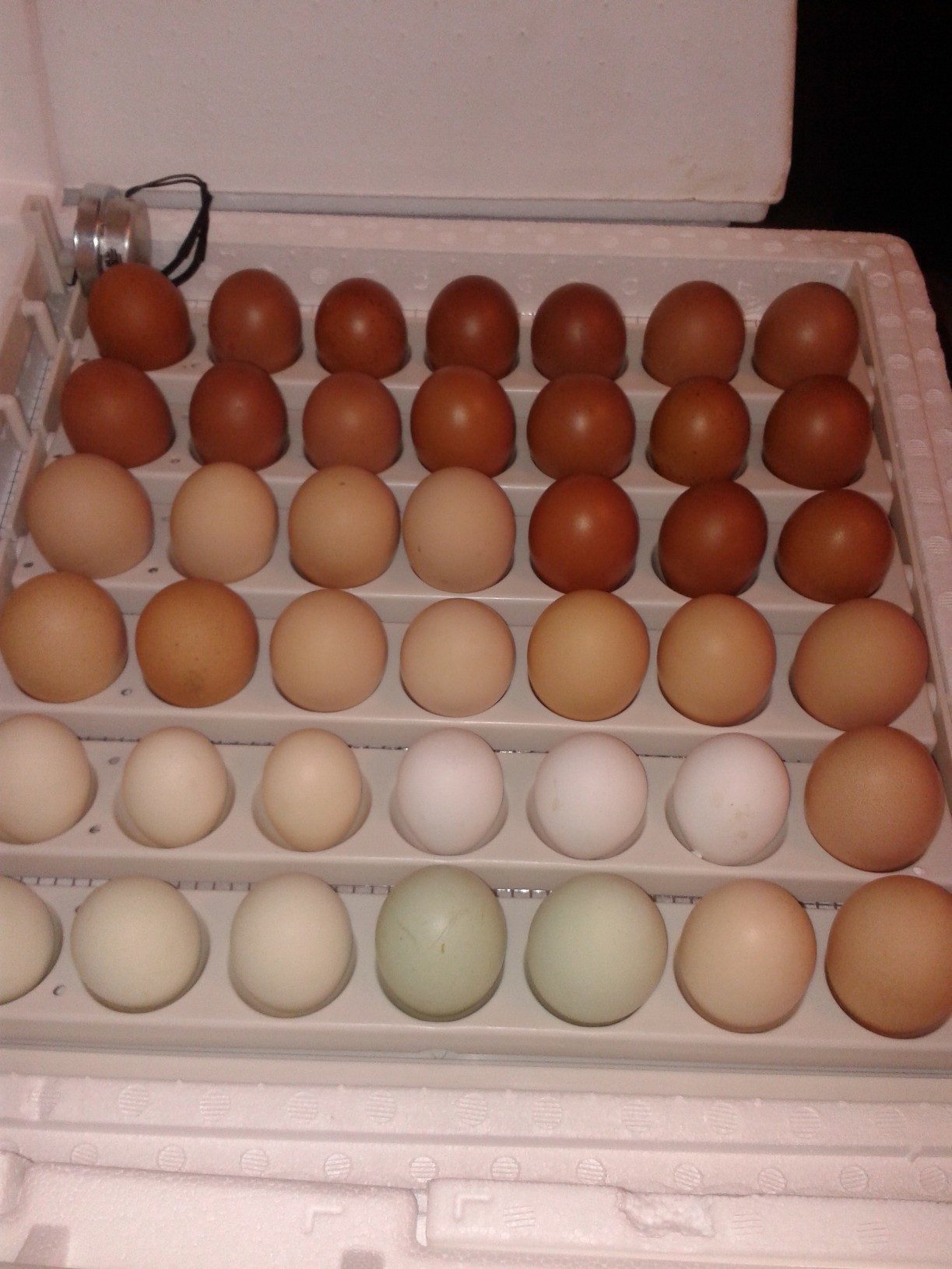 That is very interesting.We bred Marans to EE and Wheaten Ameracaunas. Out of 20+ birds we got two laying olive green eggs. The rest are laying dark brown eggs some as dark as the original Marans. Two of the hens are each laying two eggs a day .... at that rate I don't care what the color is, LOL. We are placing the dark egg layers back with a Wheaten Ameracauna rooster for another shot at olive green.