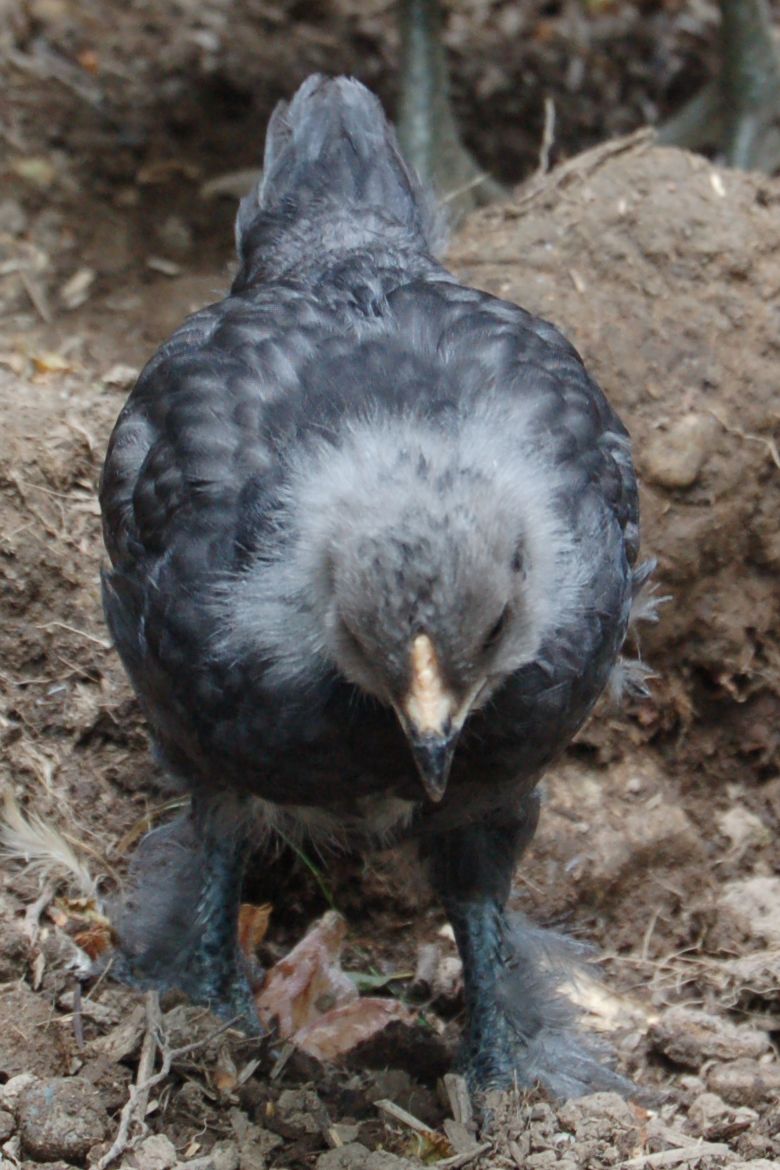 Showing off my Olive Egger babies! These four are FBCM over EE, lovingly hatched by our excellent first-time broody EE hen. They are 4 weeks old today and are just a delight to watch. So far all four are various shades of black to gray with no colored feathers appearing yet. All seem to be developing itty bitty single combs and have lightly feathered legs.