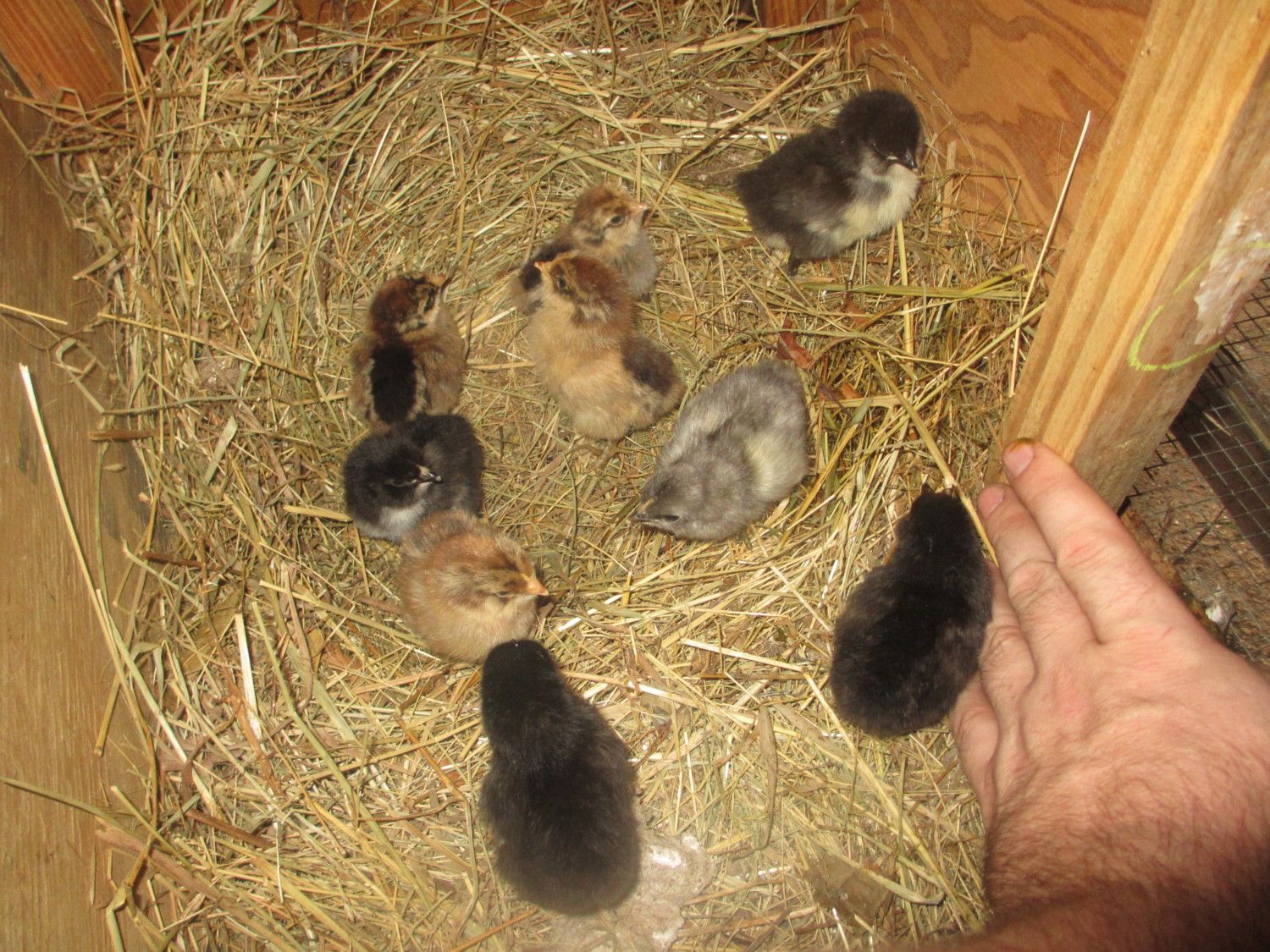 Batch#4 June 27 Ducky the OE with F1OE roo over green/blue eggs {8 have hatched last night} 2 black,1 silver, 5 shades of chipmunk.