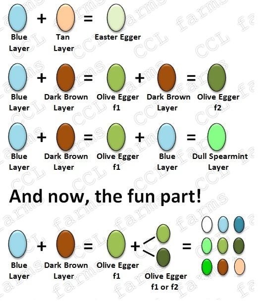 My understanding from conversations with people breeding for OE is that it's not this simple even in the F2s. I am told that the only "guaranteed" way to get OE is in F1 and that not ALL F2 will lay a darker olive egg even when the F1 is an Ameraucana (double blue egg gene) cross. Am I missing something? I understand that most folks are using Ameraucana for the cross because of the pea combs being connected strongly to the blue egg gene. Perhaps the confusion is coming when the cross is NOT with Ameraucanas?