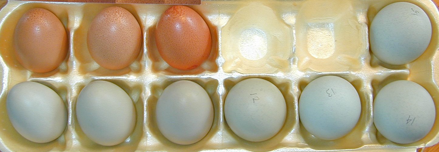 I can see clearly now the rain is gone. I have to admit, I was very confused.Only half of all offspring are pullets at best and only half the pullets will carry the blue egg gene even from an F1 EE so 1/4 of an EEs offspring might produce colorful eggsMixed breeds are always a crap shoot...some great - others not so much. EEs created from one Ameraucana parent will have a pea comb (or modified pea) which is linked to the blue egg gene but Ameraucanas aren't the only purebred bird to have 2 blue egg genes or used to create the mix known as an EE...just the one used most often and the one with a dominant pea comb. OE is just another name for an EE bred with the hope that pullet offspring would produce a darker version of the green EE egg. Most often a Marans (dark brown egger) is mixed with an Ameraucana (blue egger) to make an OE. Clear as mud?
