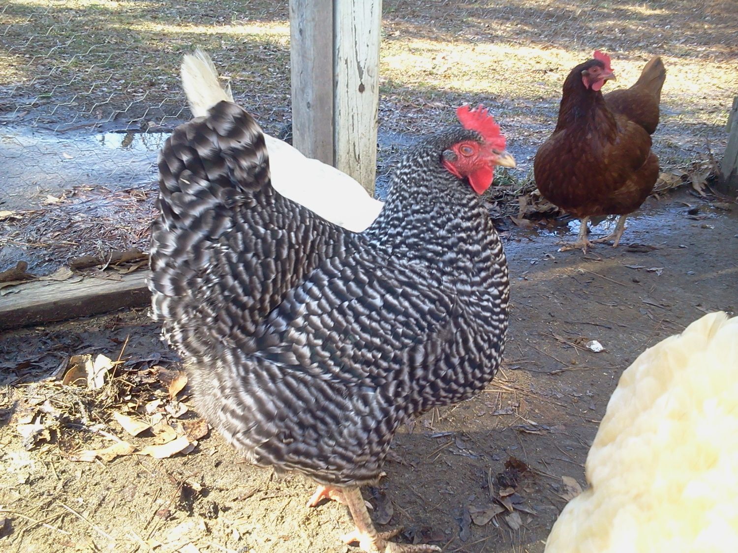 Can you see how high the tail is on your hen? That is a serious fault in a Rock. This suggests that the breeding is very suspect. Your hen has a nice breast, and a fair head, but the top line and tail miss the mark for a Rock altogether. There are reasons why that I won't get in to, unless you want to know why.