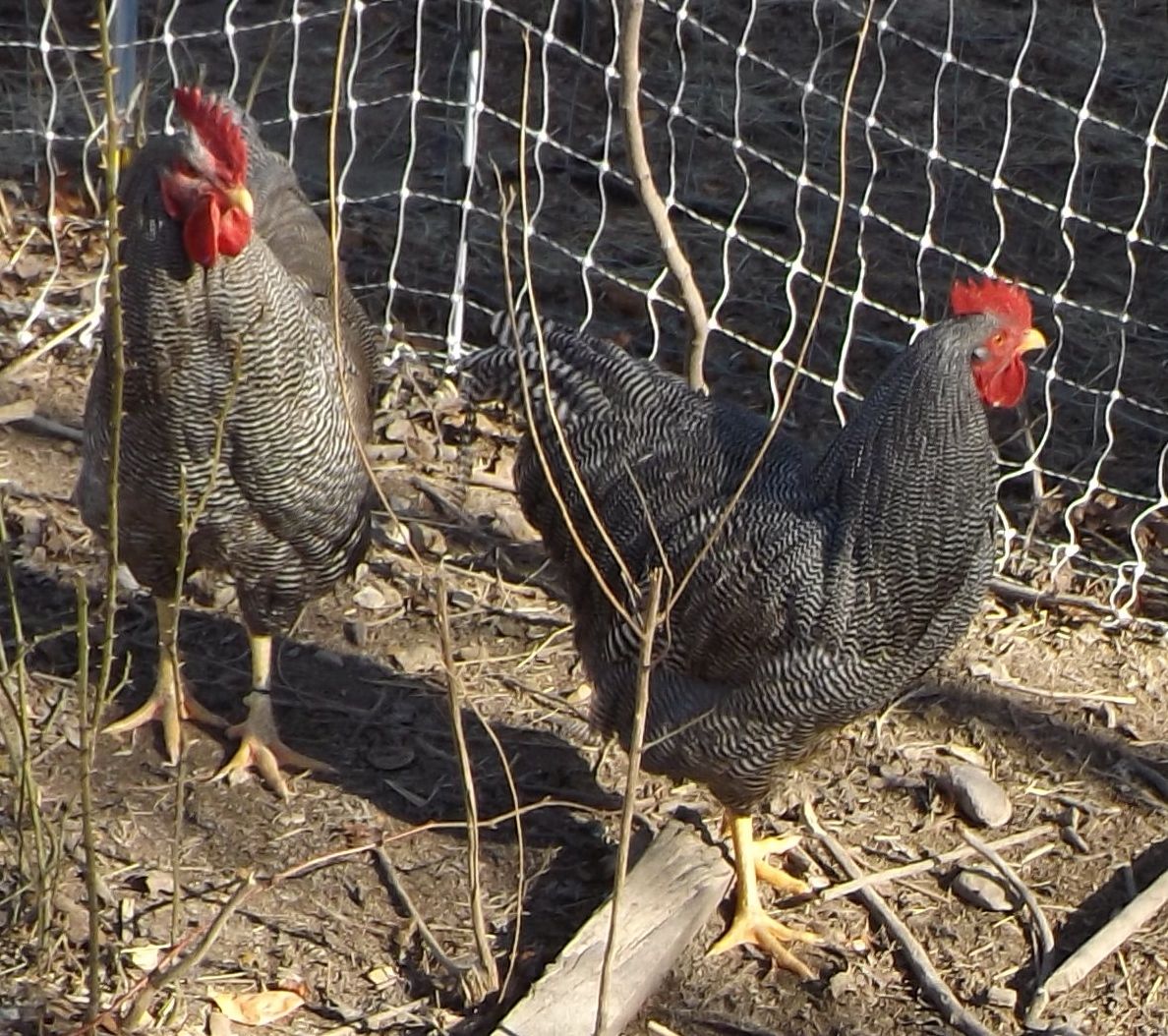 The male on the left is showing far too much brassiness. We teach culling hard for anything brassy. He'll be chilling in the refrigerator before week's end. Maybe you can see the "Black Band" on his left leg. Yup, that's what that means.