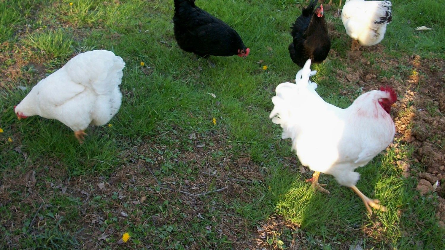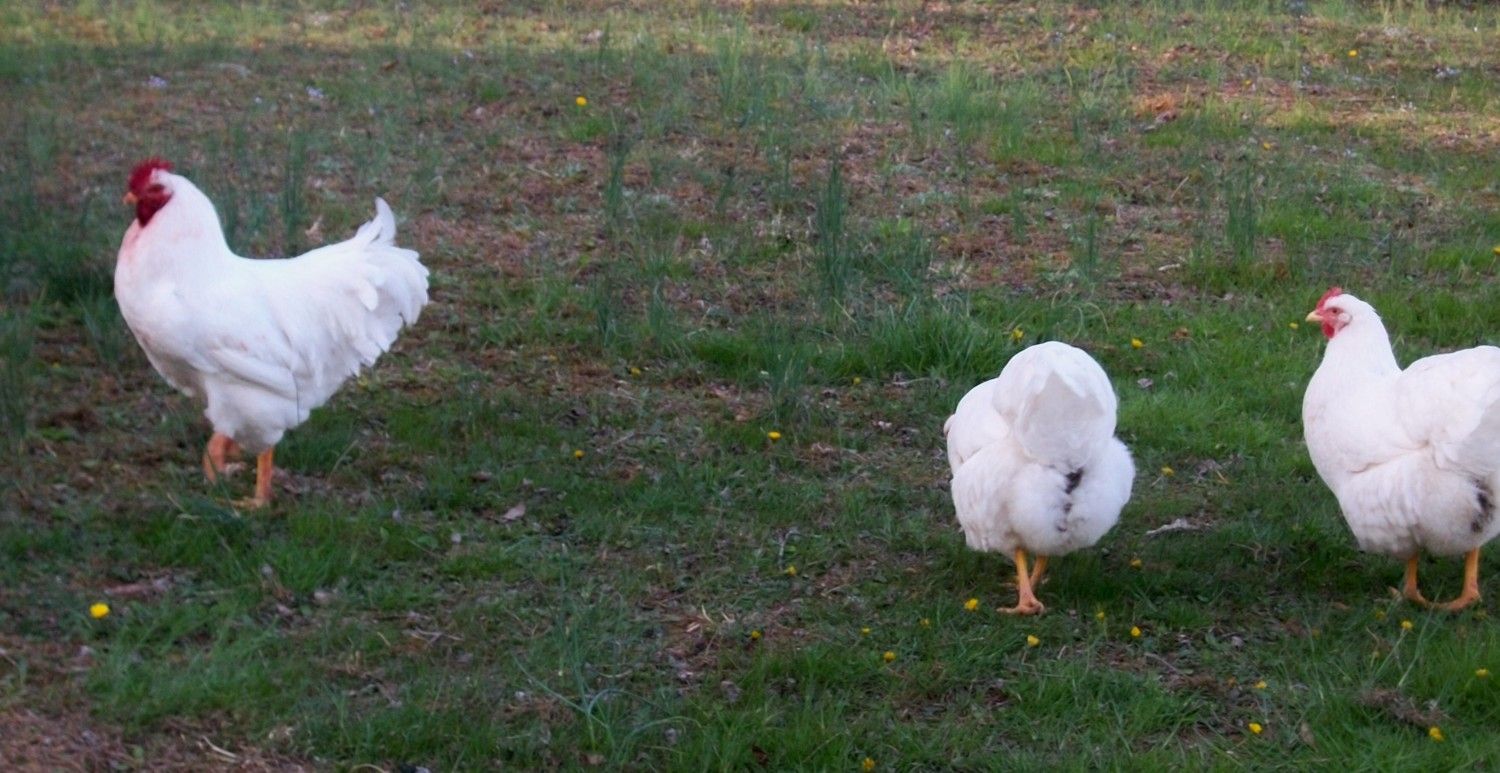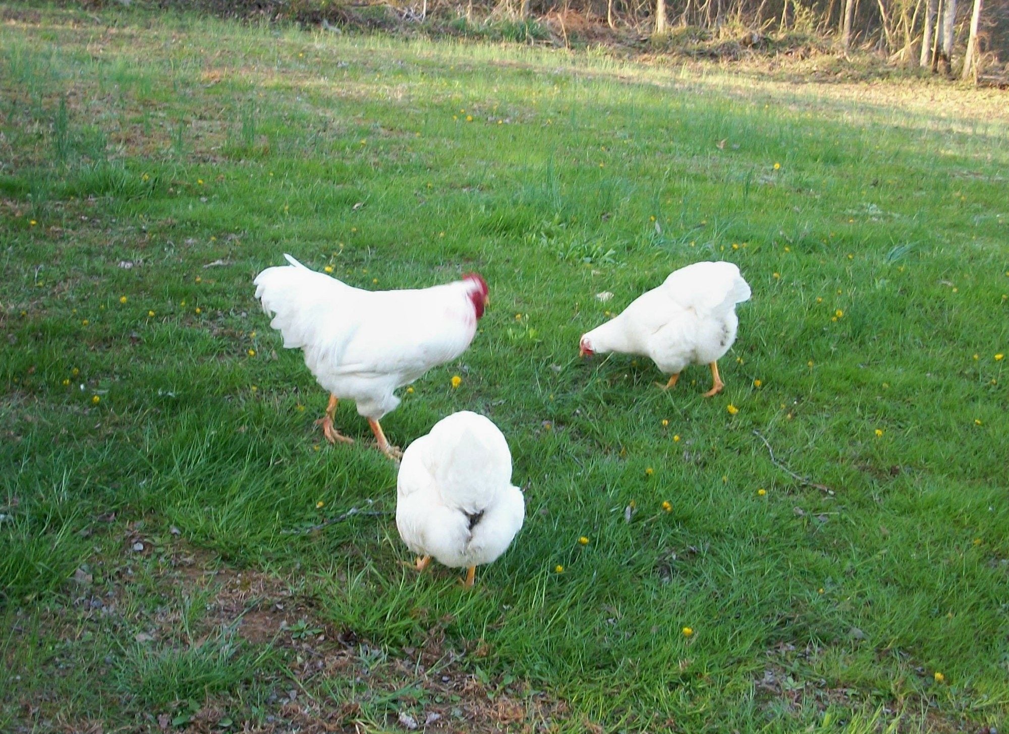 He had a bit of a scuffle when he got to the green~hence the bloody wattles~ but his superior quality of size, weight and just plain ol' attitude of taking care of business left him the victor and to the victor goes the spoils...he won the flock. After being shipped overnight in the mail, riding all over town and 20 miles home in the back of a truck, no water or food...he steps out in WV like he's the governor, didn't act a bit scared or frazzled, kicked some tail, spit out the blood, drank some water, ate some feed, foraged and then bred with the best hen in the flock in his first breeding.