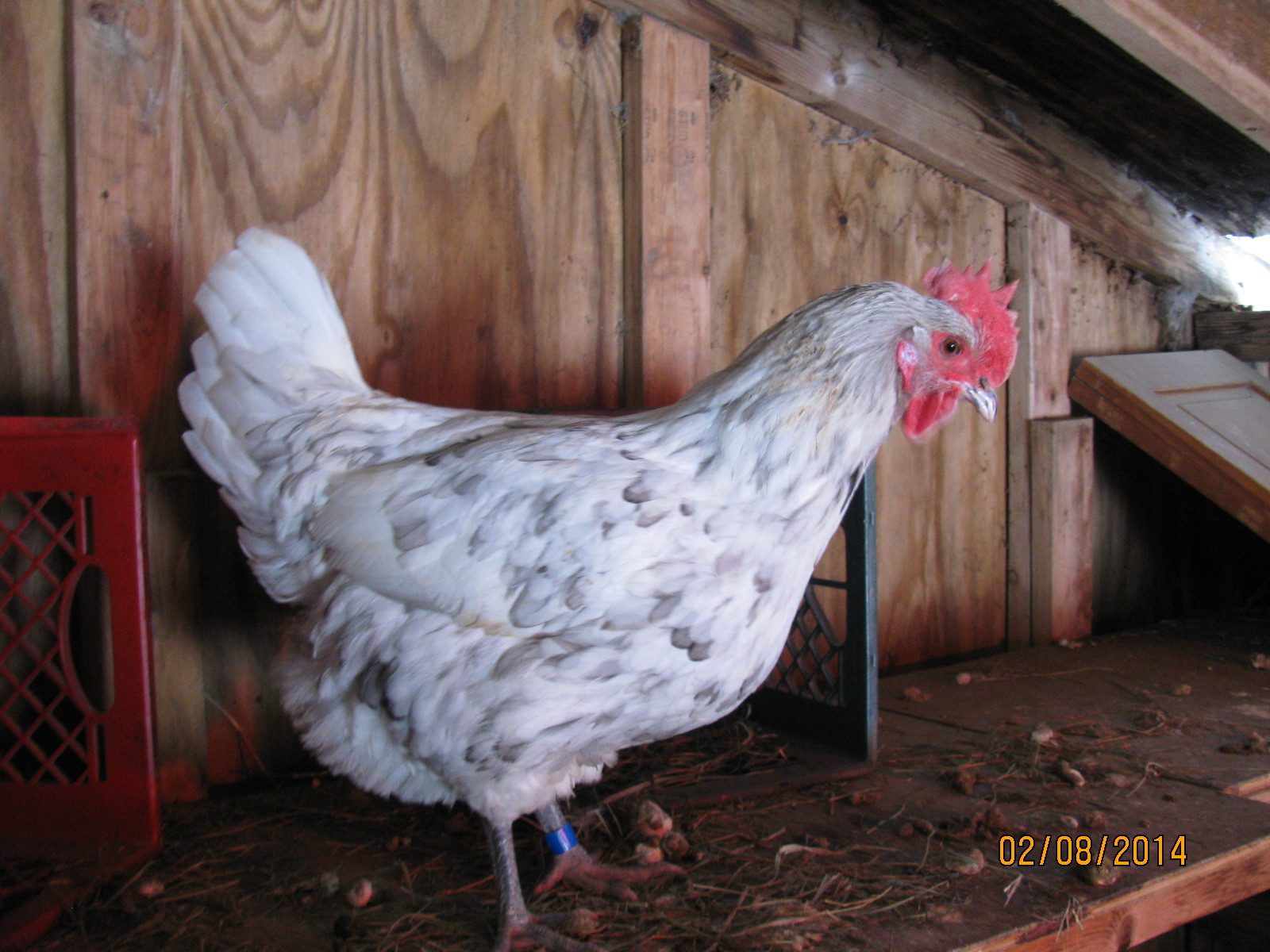 One word of advice on the Andalusian cross: use as big and heavy bodied a "Rock" as you can. The Mediterranean size and shape is very distinct in the offspring, and difficult to lose. Particularly if using hatchery-type Rocks that have already been crossed with Leghorns. Here is a splash pullet that resulted from mating a Blue Andalusian male over a blue barred female that was 1/4 exhibition Barred Rock and 3/4 Cobb broiler breeder. She is still a bit refined for me, and her dam weighed 14lbs.