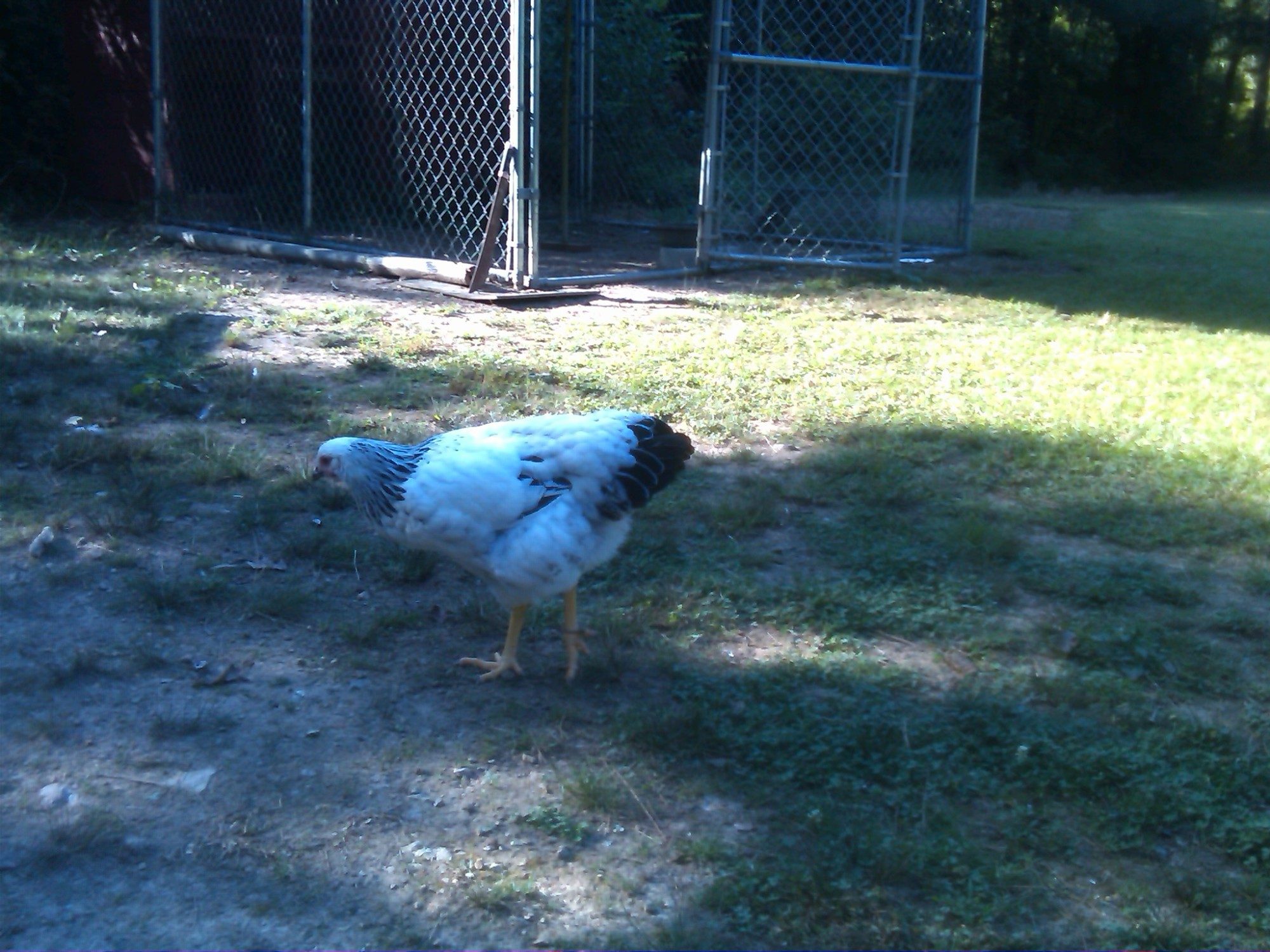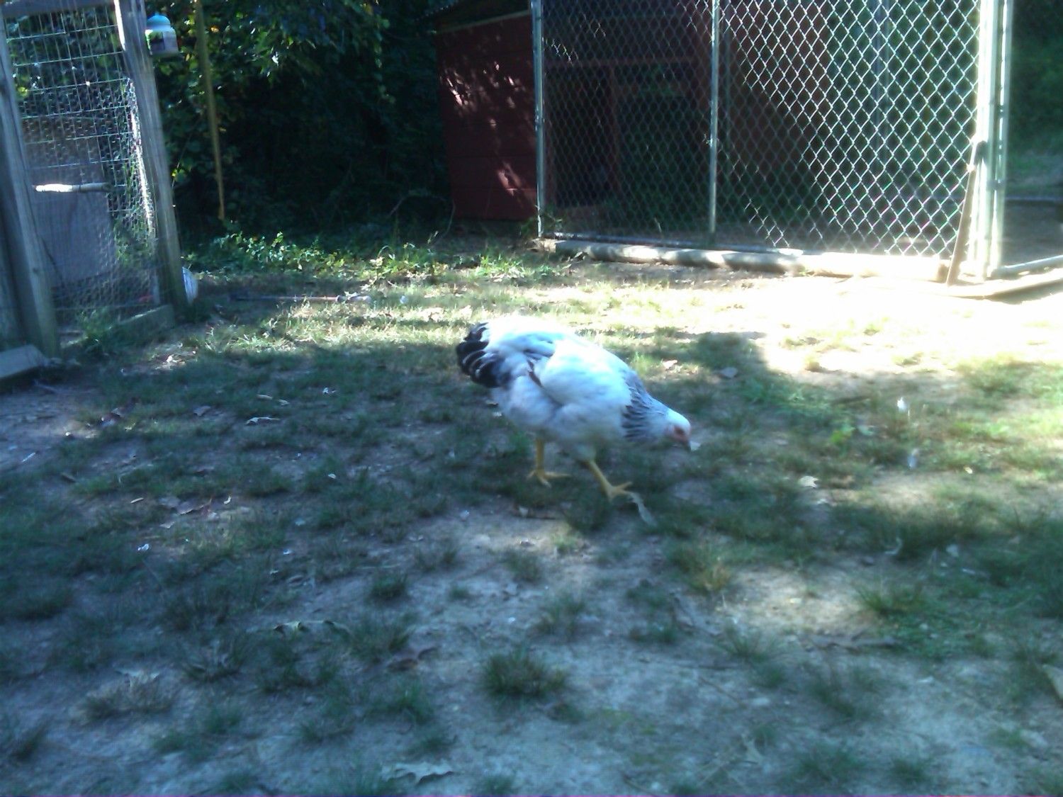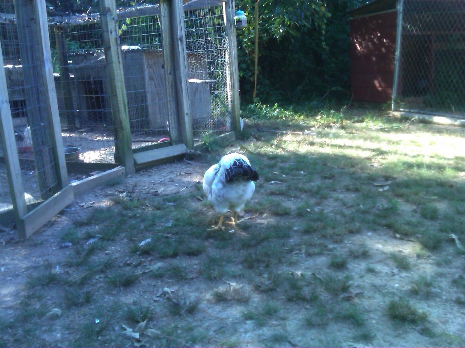 We've been so doggone busy this summer, I don't want to put a ton more on DH, so I told him that if we can get just 2-3 pens built, I'd be happy with that. One of them is my SPR pen. The coop is upon stilts, which is great for the birds in the nasty weather; if it's hot,they can get underneath for nice shade (and that's where they dust bathe, too) if it's raining, they can still be outside and dry. But...I have to crawl around on my knees to get that coop cleaned, and I ain't getting any younger!