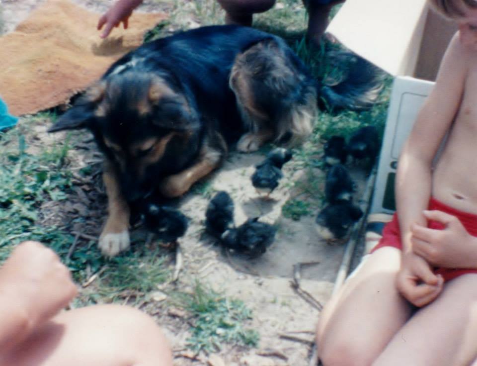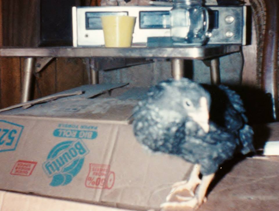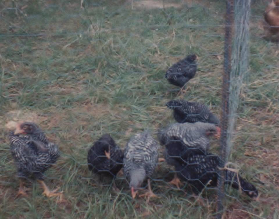 My Irving as a 3week old baby (on me), 3 week old hen on box & the whole flock as chicks (with my Australian Shepherd caring for them) & the whole flock older. This was from early 1990's. Bought @ farm supply in Alabama. Was told they were Dominackers by some & Plymouth Barred Rock by others. I LOVED them either way.