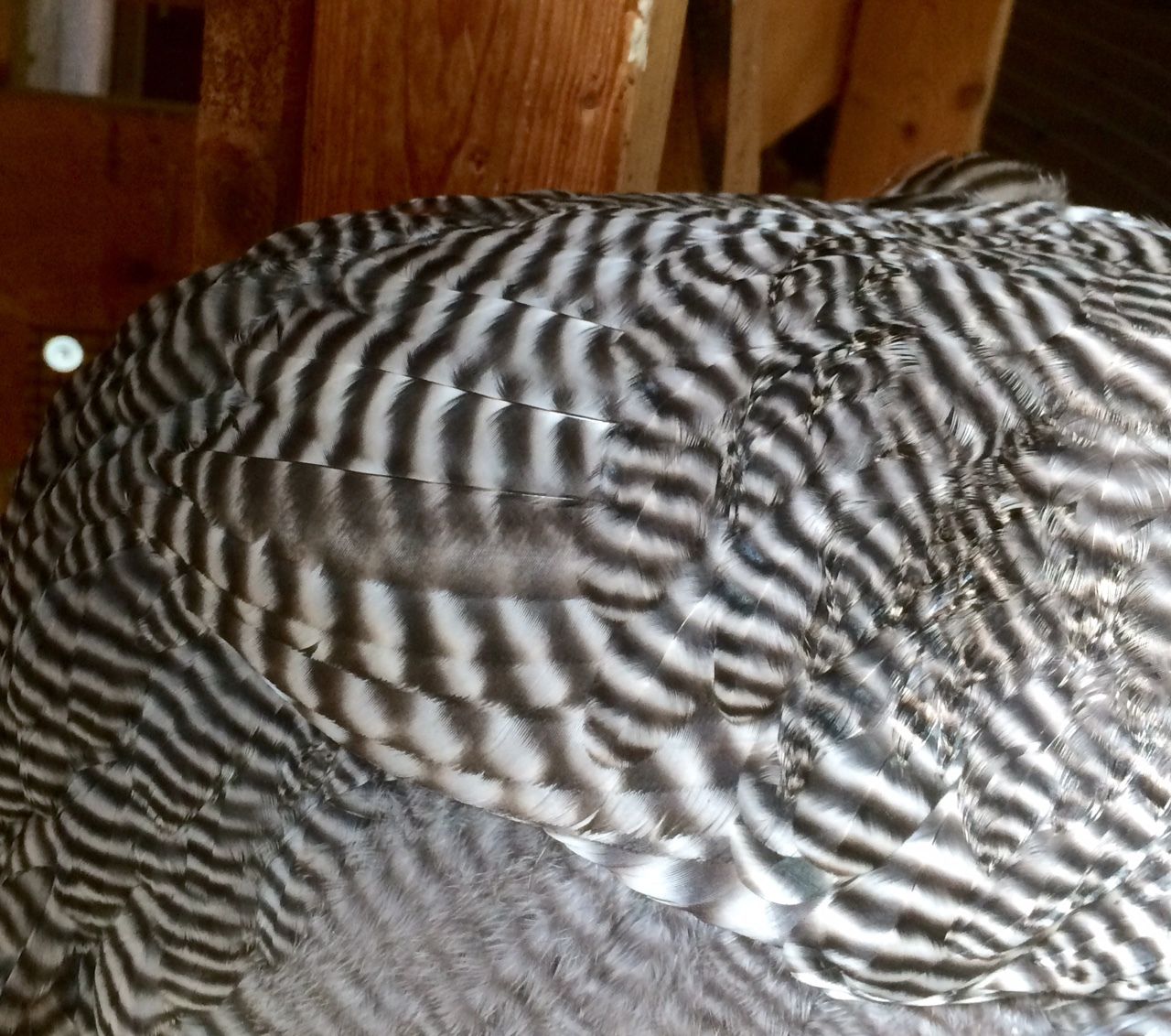 (That little grey/white area is just flash). This cock bird (named Alpha One) also just so happens to be the grandsire of these F1 females. His tight feathering and super tight barring is a compensatory matchup for them. This same cockbird was also the sire of Normanack's gorgeous pullet, who has great, tight feathering.