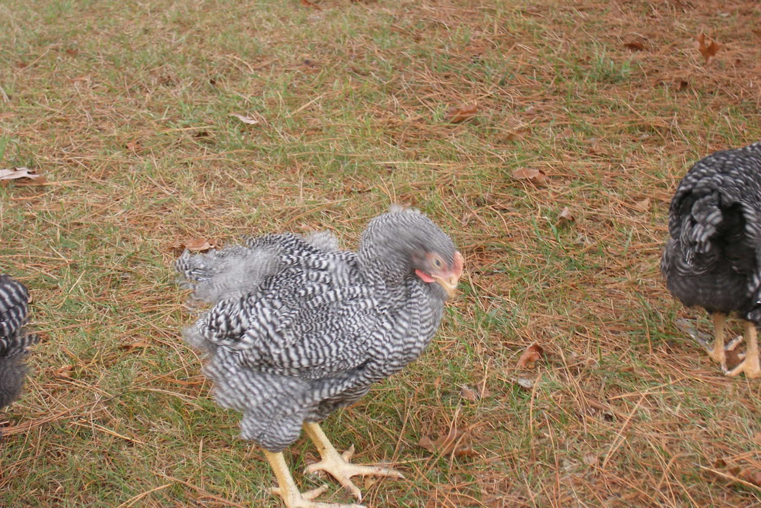 The cockerel, however, is another story. The tint is common with Barred Rocks and is usually blamed on sun, corn feed, and other things. My guess is that he'll "clear up" this winter.