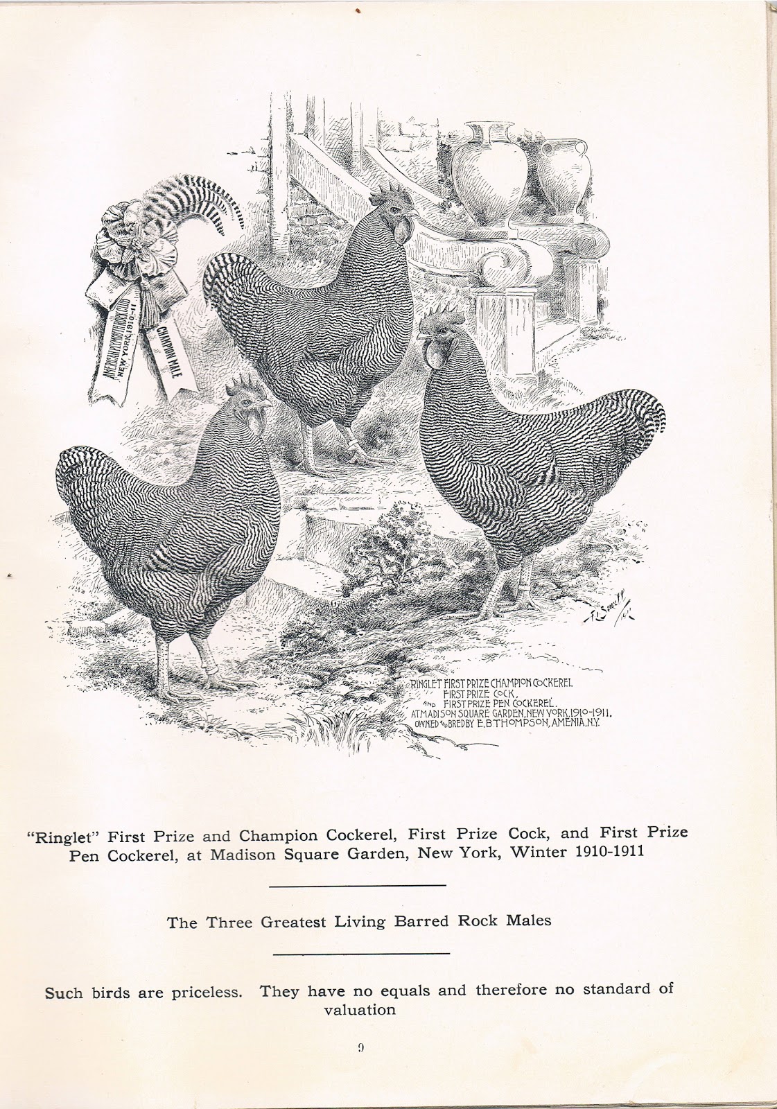 The ringlet type Barred Rock, which we also own, is the great example of what a Barred Rock should be, according to the standard. This is the aspiration or the goal of Rock breeding. What passes for a Barred Rock in most cases is a bird that is so far from true type that it would be disqualified if judged. In most cases, it isn't even within a country mile of the standard.