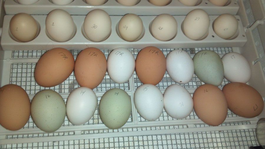The numbers on each of them are the day they are due. I usually put eggs in my incubator as they are laid - I don't usually hold them and set them all at once. The R means it was a refrigerator egg (there are a few taken from nestboxes today too). I'll be able to candle them in a week and see if there is any development. At that point, I'll decide if it's worth it to continue doing this or not. If any of them have developed, it will be kept through hatch. But if only one or two develop, I probably won't do this again.