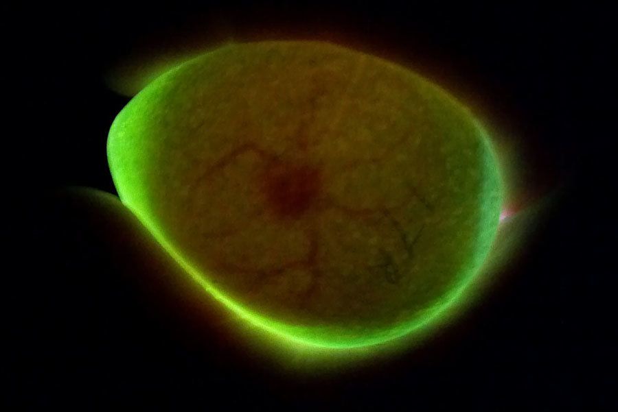 I'll try to keep getting more photos as they progress in development. But it's easy to see the blood vessels here, and the developing embryo in the center!
