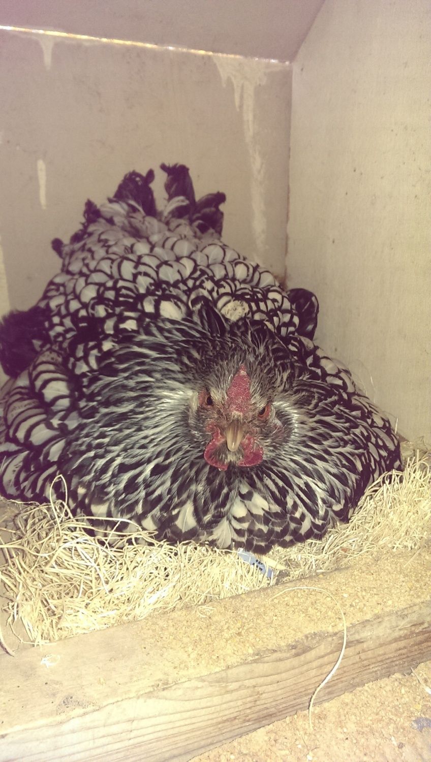 Check out my broody mama, Waffle. She is sitting on 8 eggs. I don't think she's ever laid a fertile egg. She doesn't let the rooster breed her. Her feathers are perfect (well, near). I guess she's ok being a surrogate, though. Unfortunately, she is my fanciest hen. She is Jerry Foley lines, and I got her from Jim Monk. Sigh. After this batch, I'm going to cross my fingers that she gets laying again.