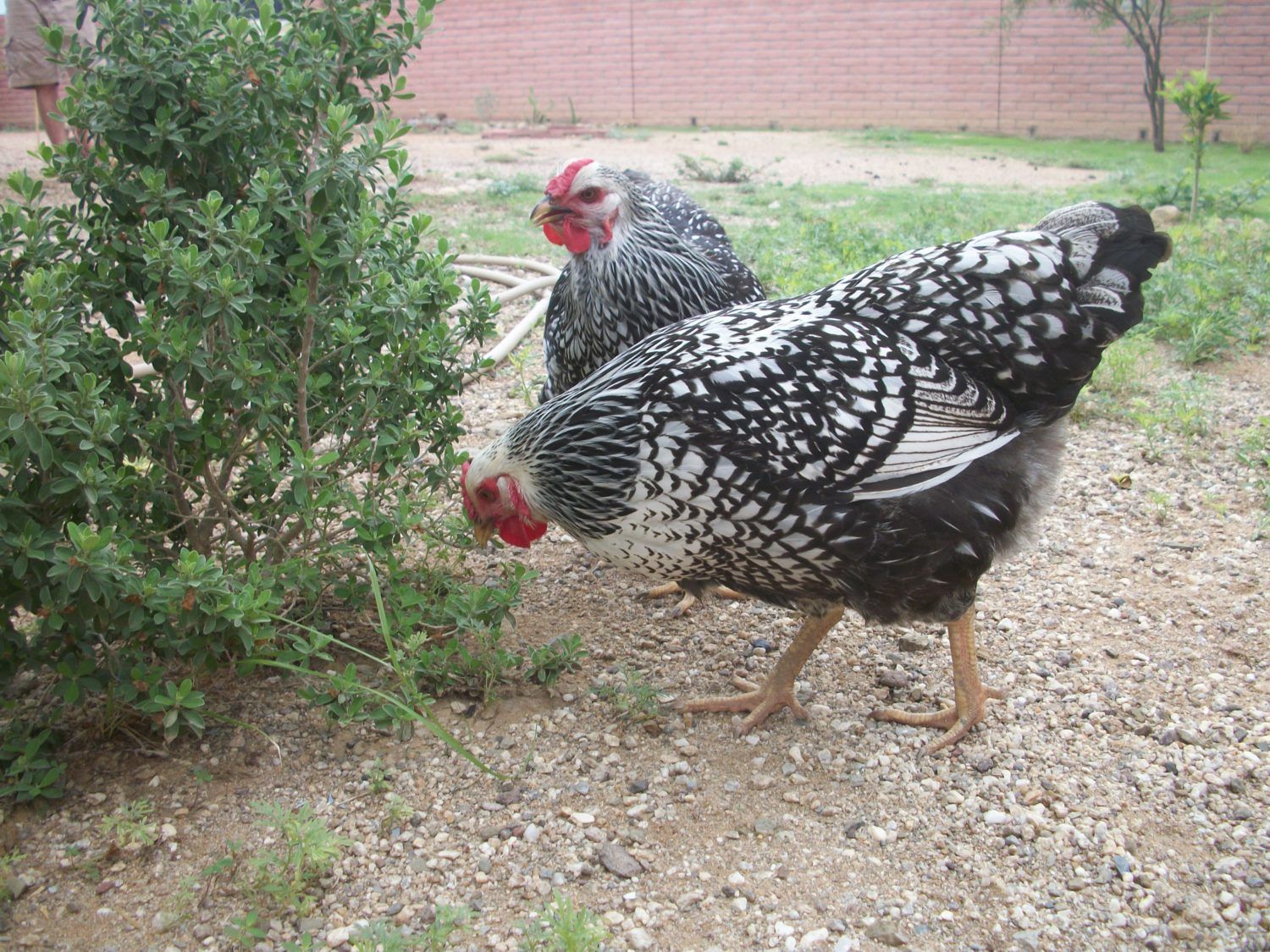 Here are Stubbs and Skaggs (in the back) checking out the sage bush. Now, while Stubbs has a soft perfect little "buck buck" voice, Skaggs is the opposite. I have never heard a buck, cluck, or chirp from her. Skaggs has the most God awful ...I don't even know how to explain the sound..."Eeeeerrppppppeekk!" It is the only sound she ever makes. When she wants a treat she screams, when she is foraging, when she is simply standing still, she screams the sound. It is such an ugly sound. When I go out in the morning to give them treats all of my ladies purr or chirp softly to say hello and thank you for the treats and then there is Skaggs, making her horrible dinosaur screech. I think she is saying the same exact thing as the other hens, just in her own "Special way" I wonder why she only makes one sound, even when sitting on our laps and grooming she screeches...We love her just the same.
