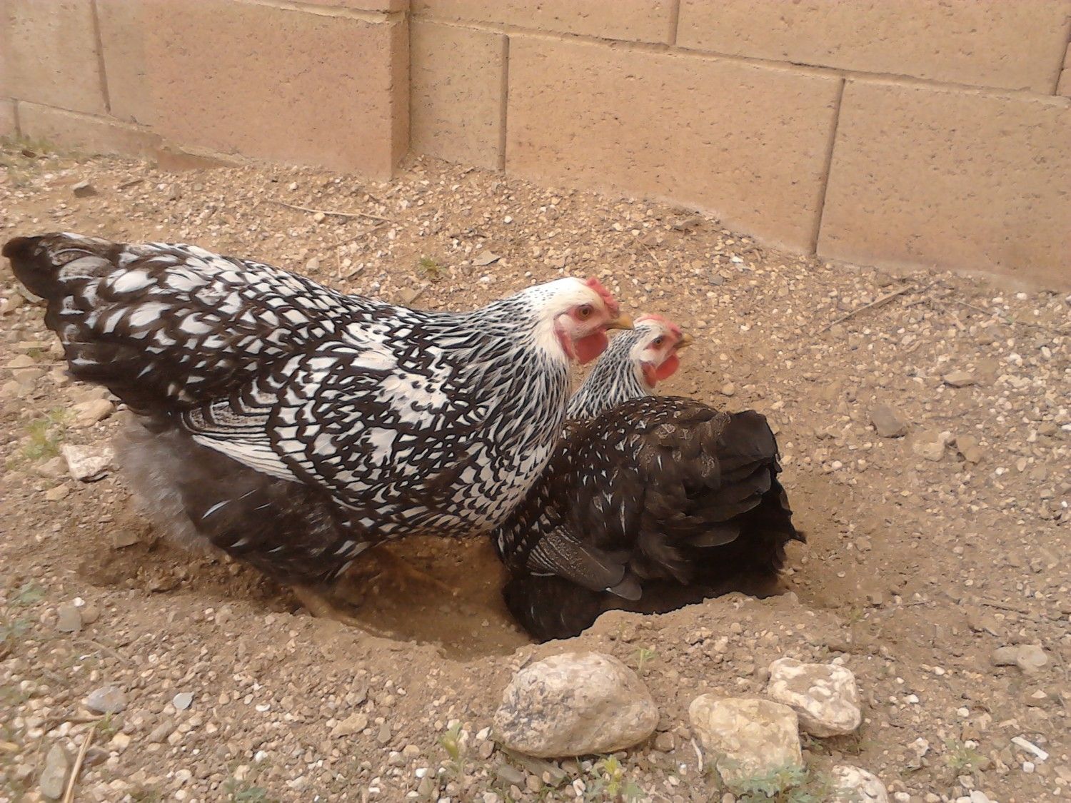 Taking a dust bath together. Now Skaggs may not have her sister's lacing, or her voice, but she does protect her sister. Stubbs has found herself on the bottom of the pecking order and Skaggs is always there to defend her against the bullies. She makes sure her sister is never left alone. Even when Stubbs is laying an egg Skaggs will go up and keep her company more often than not. (So adorkable!)