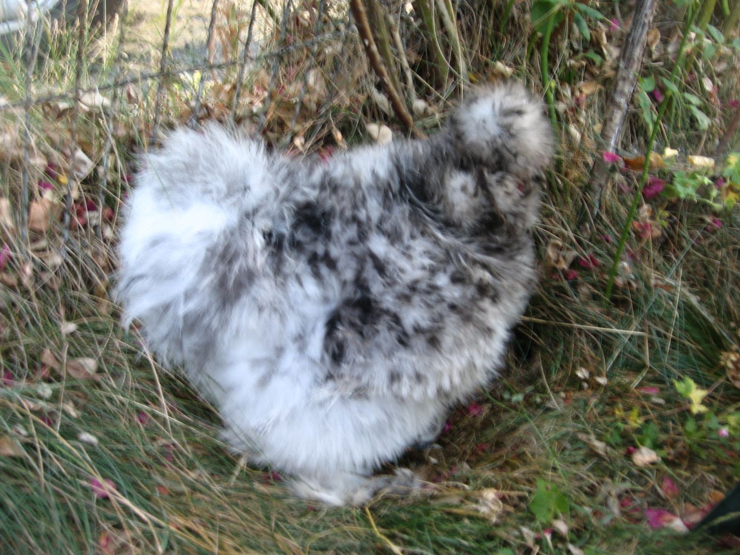 Oops! You're right! The one on the left, someone told me is called a frizzle sizzle. I never saw a frizzled silkie, but if yours is the frizzle silkie, that's one spectacular bird! These ones I have are only 1st generation. You have such a gorgeous bird! A splash frizzle silkie would be extremely rare I would think. I sure hope you can keep the line going on those!Actually the one on the left looks to be a sizzle not a frizzled silkie, which means its a frizzled silkie with the hard barbed feathers. A frizzled silkie is a silkie with the frizzling but has silkie feathers not the hard ones like your sizzle.