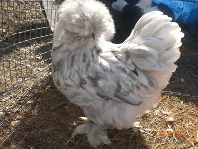 Cute.Sheri, I really appreciate all your very helpful advice - wow they sure are cuteYes, definitely Frizzled Silkie (Frilkie for short) & it will look very different from a regular Silkie, just not quite as different as a Sizzle. Go to posts #11 & #12 of this thread for an idea of how different. Personally, I like the Frilkies almost as much as the Sizzles & I think you could still use it in your Sizzle breeding program but I'm not sure quite how to go about it. If it's a hen you could breed back to George but you would take a chance on getting some frazzled double curly chicks. However, some of the breeders are deliberately doubling up like that because the double curlies produce a higher % of Sizzles & Frilkies than a regular Sizzle. I've read about it & considered it but I'd want to get a lot more info first. For instance, would doubling the frizzle gene also bring a lot of DQ's to the surface again? I like to show my birds so to me it wouldn't be worth taking a chance to 100% Sizzles if they all have red single combs, pink skin, & 4 toes. For what it's worth, here's what I would do. Buy some Sizzles (eggs or chicks) from a breeder that is several generations along. Whichever you buy, keep & raise both varieties - smooth & rough. You can breed any smooth hens back to George & then keep a smooth to pair with your frilkie baby. That way, you can keep 2 lines going if you want - Sizzles & Frilkies. If you don't like the Frilkies, you can sell those & just keep the Sizzle line going or you could probably combine the 2. I think your Frilkie line will also give you some rough/smooth Sizzles you can breed back to George and/or his progeny. But maybe not, as I think both frizzled & silkie feathers are dominant so you may not get Sizzles from that line. Oh heck, I don't know. Sonoran, jimnjay, or one of the other BYC'rs with a Sizzle project could answer specific questions much better than I can. I do remember Sarah, one of the first Sizzle project breeders, saying that breeders should get rid of any Frilkies because they would be of no use in the Sizzle program. She didn't say why, but I suspect that they would possibly produce only more Frilkies or a higher percent of Frilkies than Sizzles. I think I'm confusing myself so I'd better quit with the genetic info. Anyway, from what I can see of your little Frilkie, it looks to be very nice with some good qualities to contribute to the gene pool. Dark mulberry comb that looks like it is the correct shape, nice foot feathering, dark skin. Does it have 5 toes on each foot? If so, you may end up with a Frilkie that you can show if you decide to go in that direction. Sheri