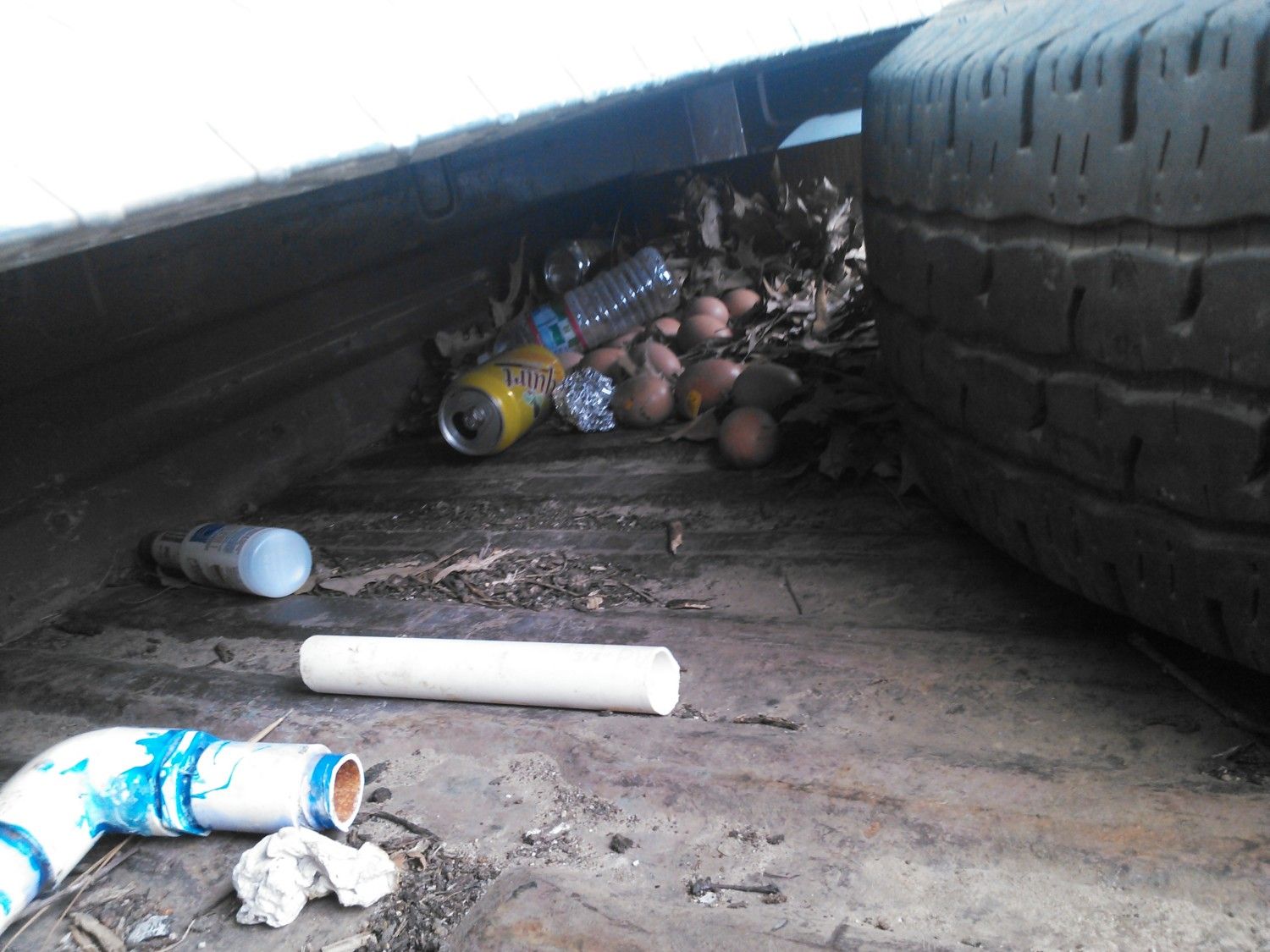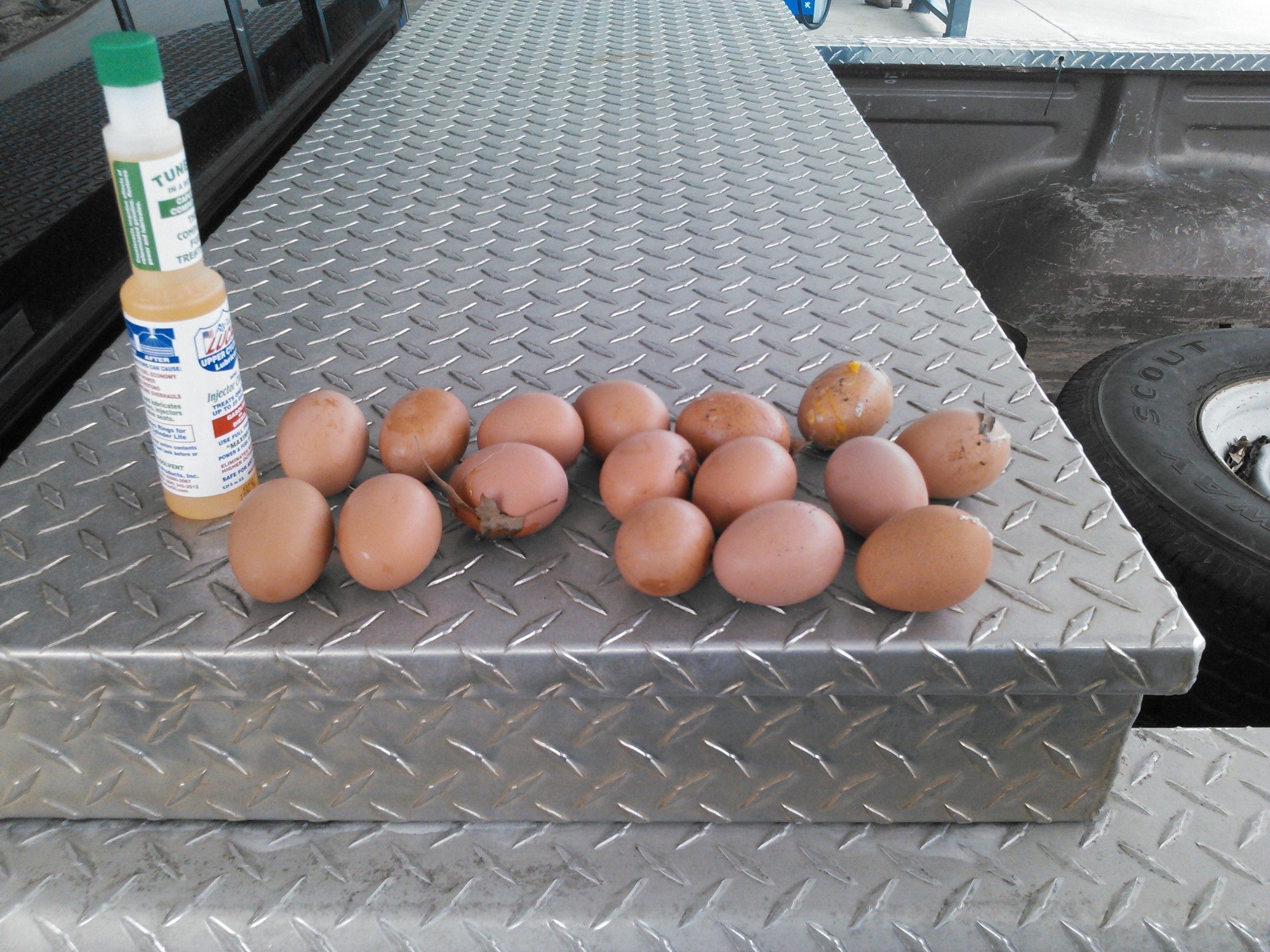 We thought we just had a slow learner. We had 4 hens and 3 eggs a day, so we were waiting for her to get her act together. We used to free range our chickens from dawn to dusk, so neither my wife or I noticed that the one hen was falling in love with my old farm truck... that is until I took it into town to get gas. As I was filling up I glanced under my tool box.....