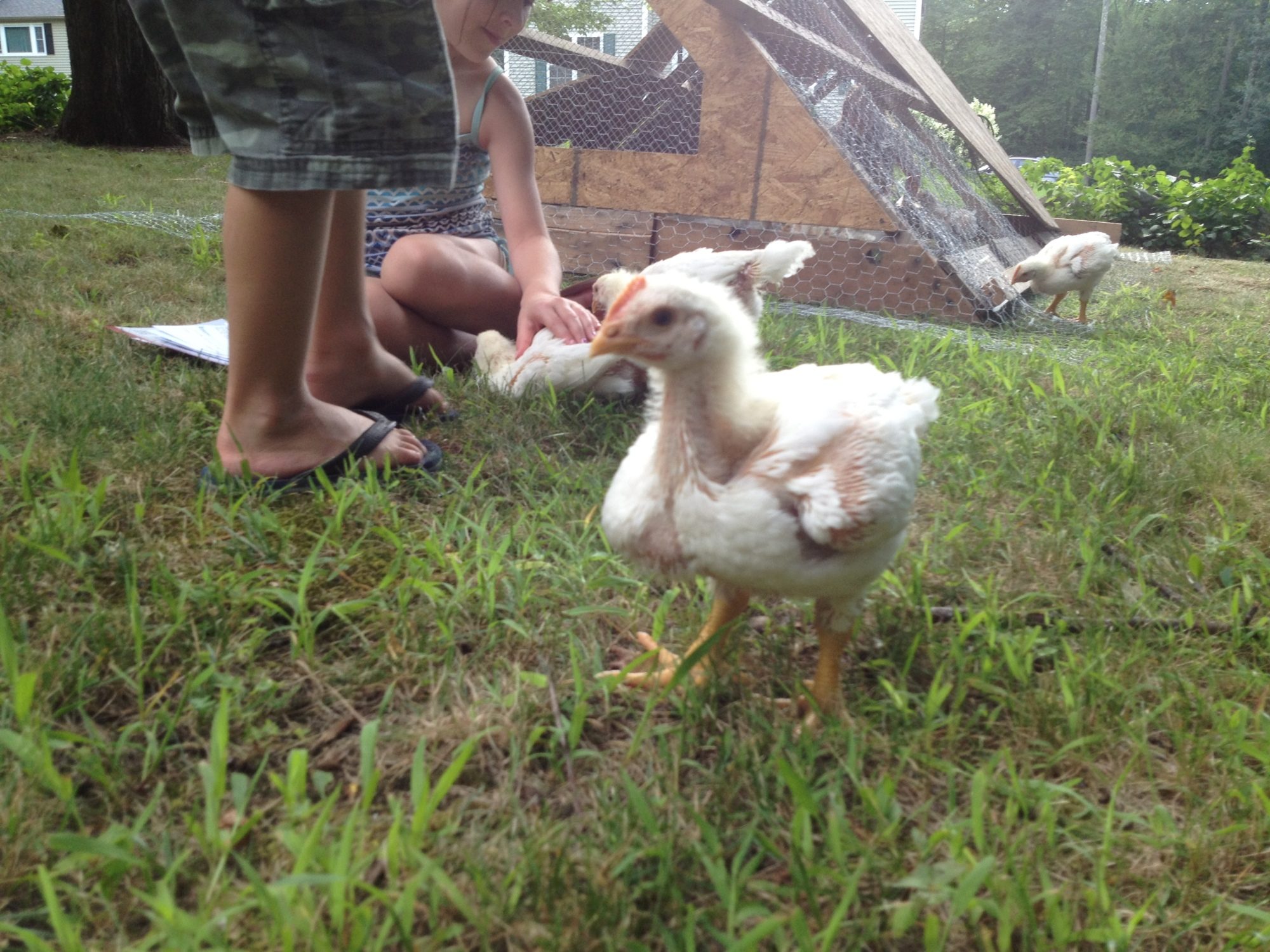 Yea its gonna get cold and it gets pretty bad the snow and the ice is crazy. Last october we has a huge snow storm went from a reg comfy day to 3 feet of snow and loss of power for a week. OUr weather is crazy. But yes I do want to do another batch but we will have to probably wait til the spring. This is our first time having to process and we are doing it ourselves so we will have to see how I feel after doing 26 CX and 2 BBWs. I think we will be able to handle it and I would love to always be able to raise my own meat. That is one reson I got our Bourbon red turkeys. That way I can breed them and always have the meat on hand. I sooo hope I dont wuss out. The protein in the feed is 22% and the broiler booster is just added vitamins to help avoid weak legs.Here are a few more pics of the CX from today next to kids so maybe you can tell the size better