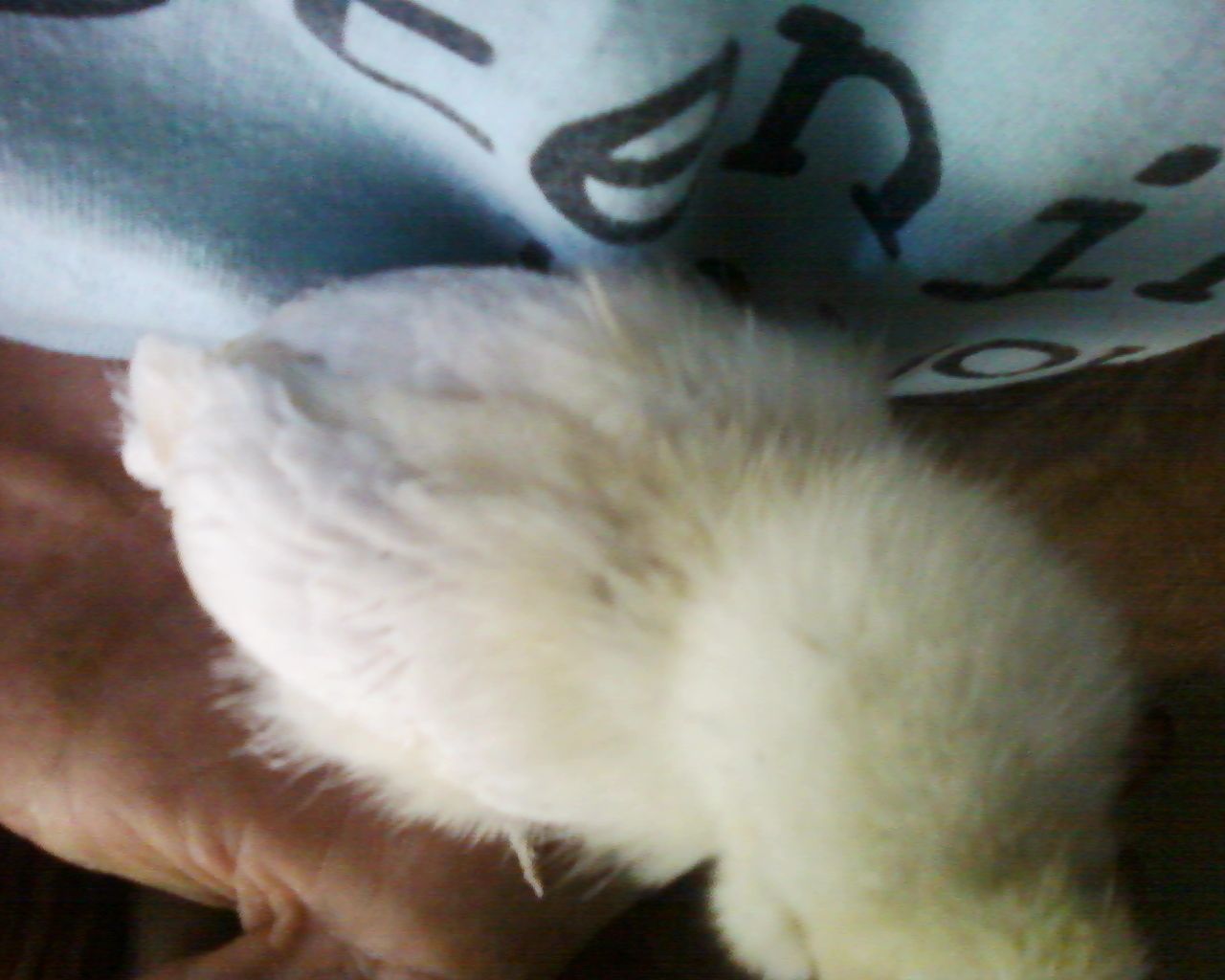 This one, the spots are more of a grey, and hard to see in the pic, but they are more like patches than spots, on the wing feathers. This chicky has leg and feet feathering, with poofy head.