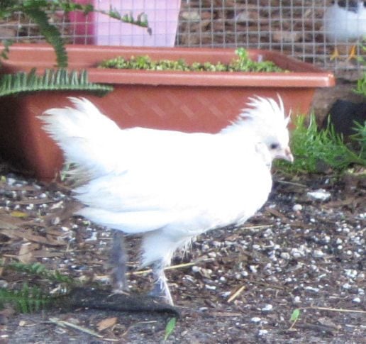 The two new roosters, Alpha and Bravo. Alpha is in the back and Bravo in the front. Bravo is my first choice in rooster. Alpha will eventually go with the non sultan pullets for the sultan color project. He has a black spot on the back of his neck which you can't see in the pictures. They came from a livestock auction so they are not in the best feather form right now. I think they have nice crests though and I'm happy with their combs. Their feet look bare but I've checked and it's broken feathers, most likely from being caged.