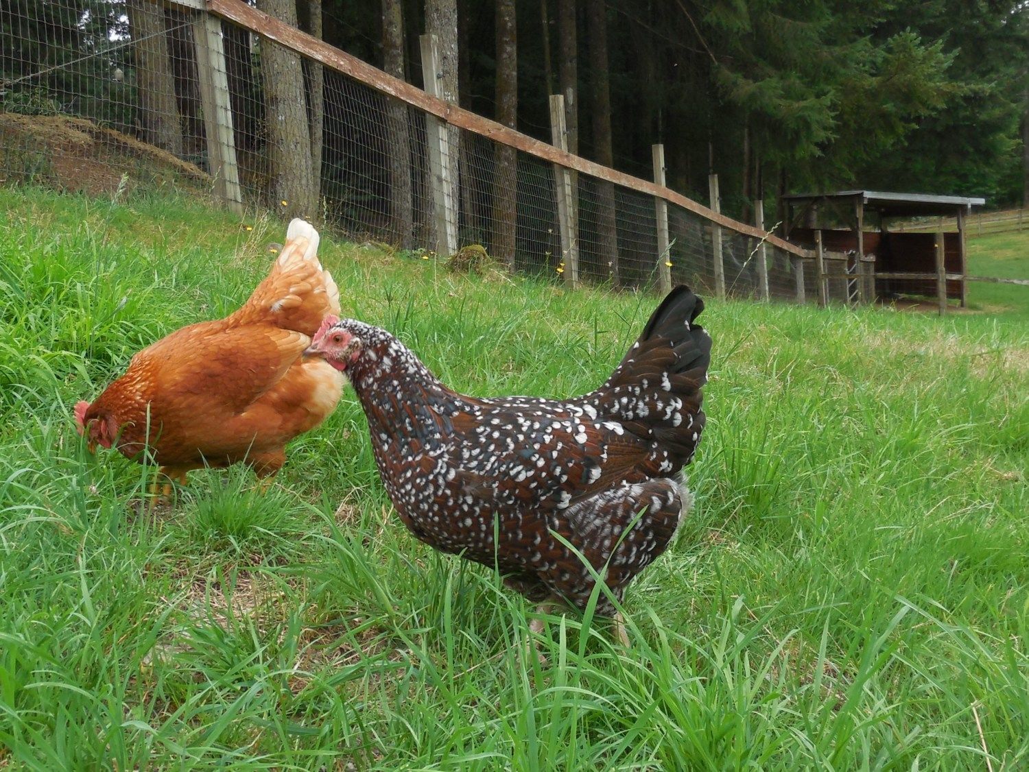 Couple pens of Silver Sussex. hens with dark roo just started laying. They're around 5.5 months old. Other birds are younger.
