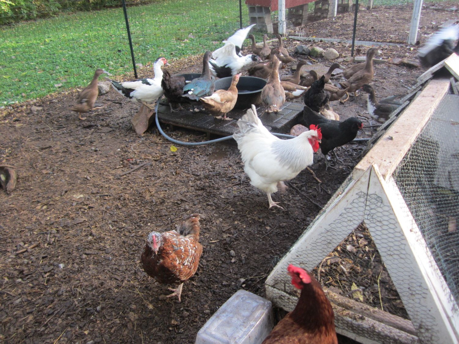 Here's my guy. He's a little dirty in the back because he either can't get on the perch (24" high) or the hens still won't let him, so he sleeps with one of my muscovy drakes on top of my nest tubs and no matter how often I clean the lid, my white chicken is always wearing some duck splat by morning. If he's staying, I'll put in another perch at 12".