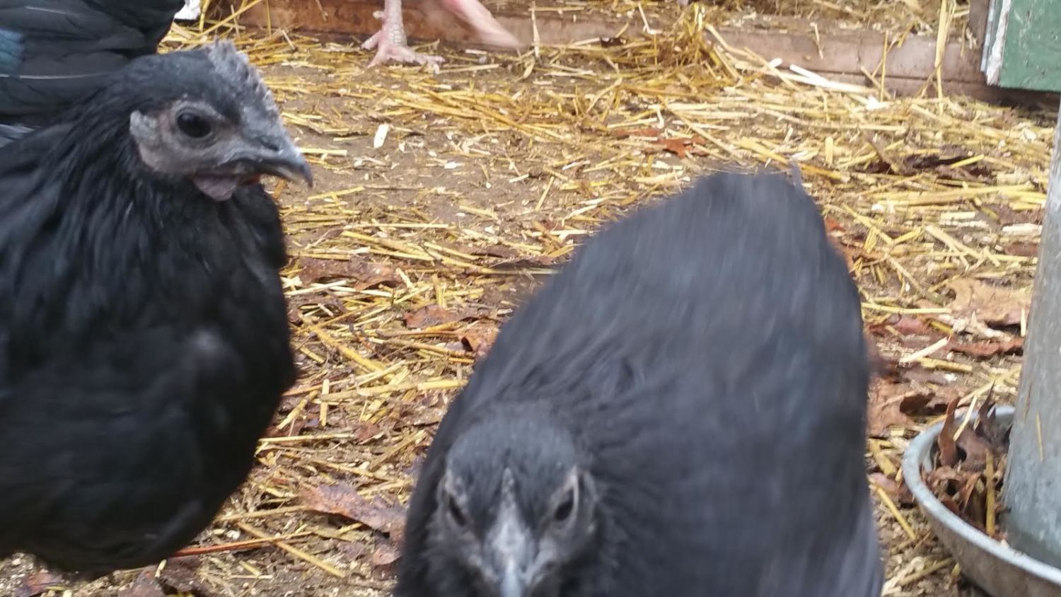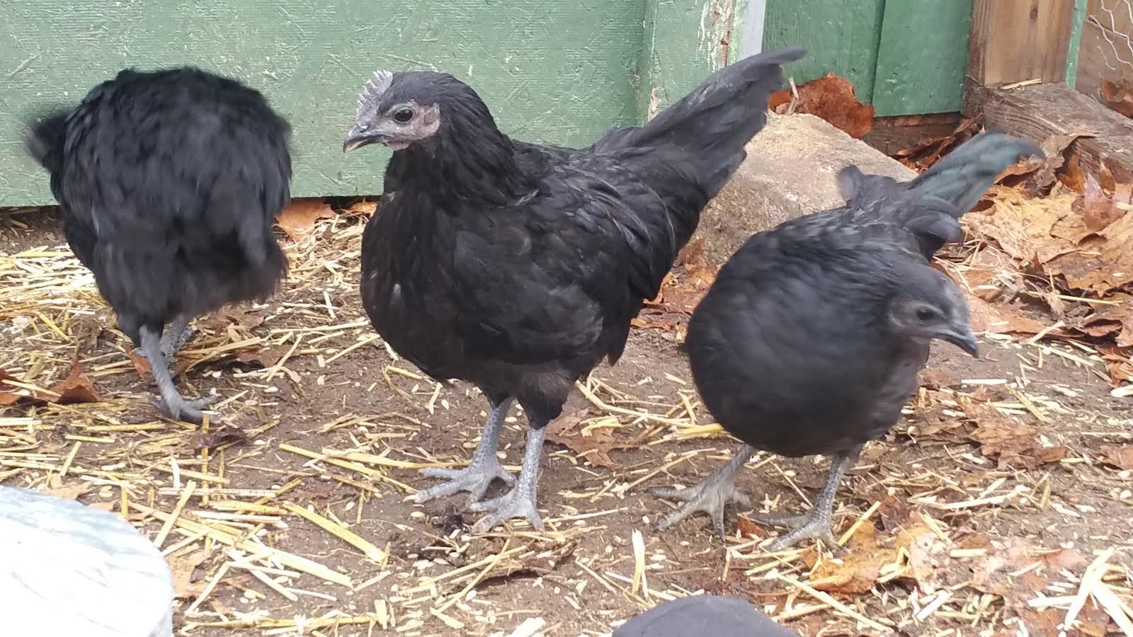 Mr. Crow is in the background here. He's the genetic brother to Jack, and was crowing in the brooder at 3 weeks old. He has red? mulberry? earlobes. He's also smaller than Jack.