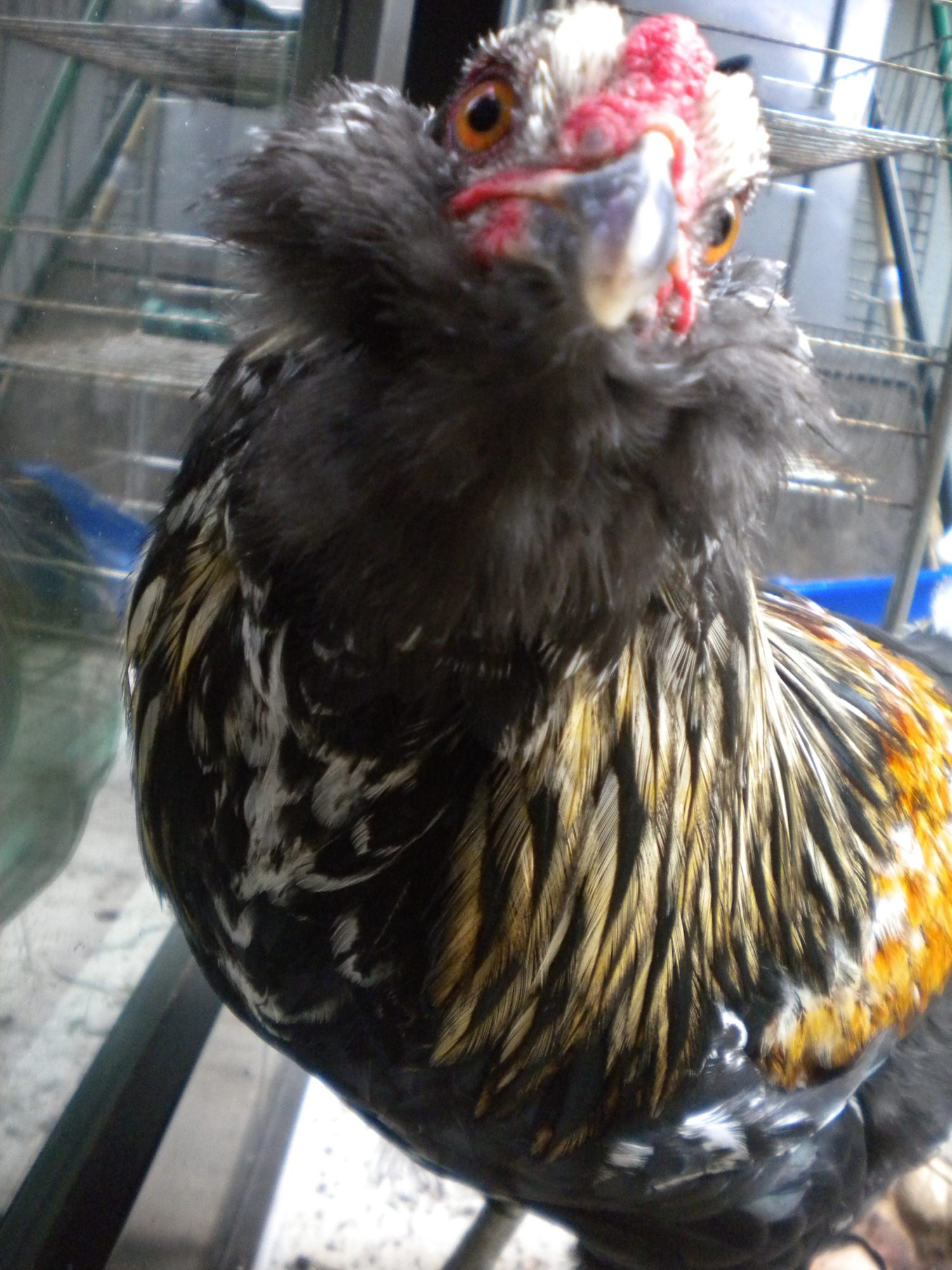 oh! thanks for asking this! I posted the "ghost chickens" picture, but now that I think about it, it doesn't really show composure.... so... can I replace my previous entry with this one?? thanks! This is Teri, my EE rooster that I had to give away... :( "What is this strange thing you're pointing at me!??!"
