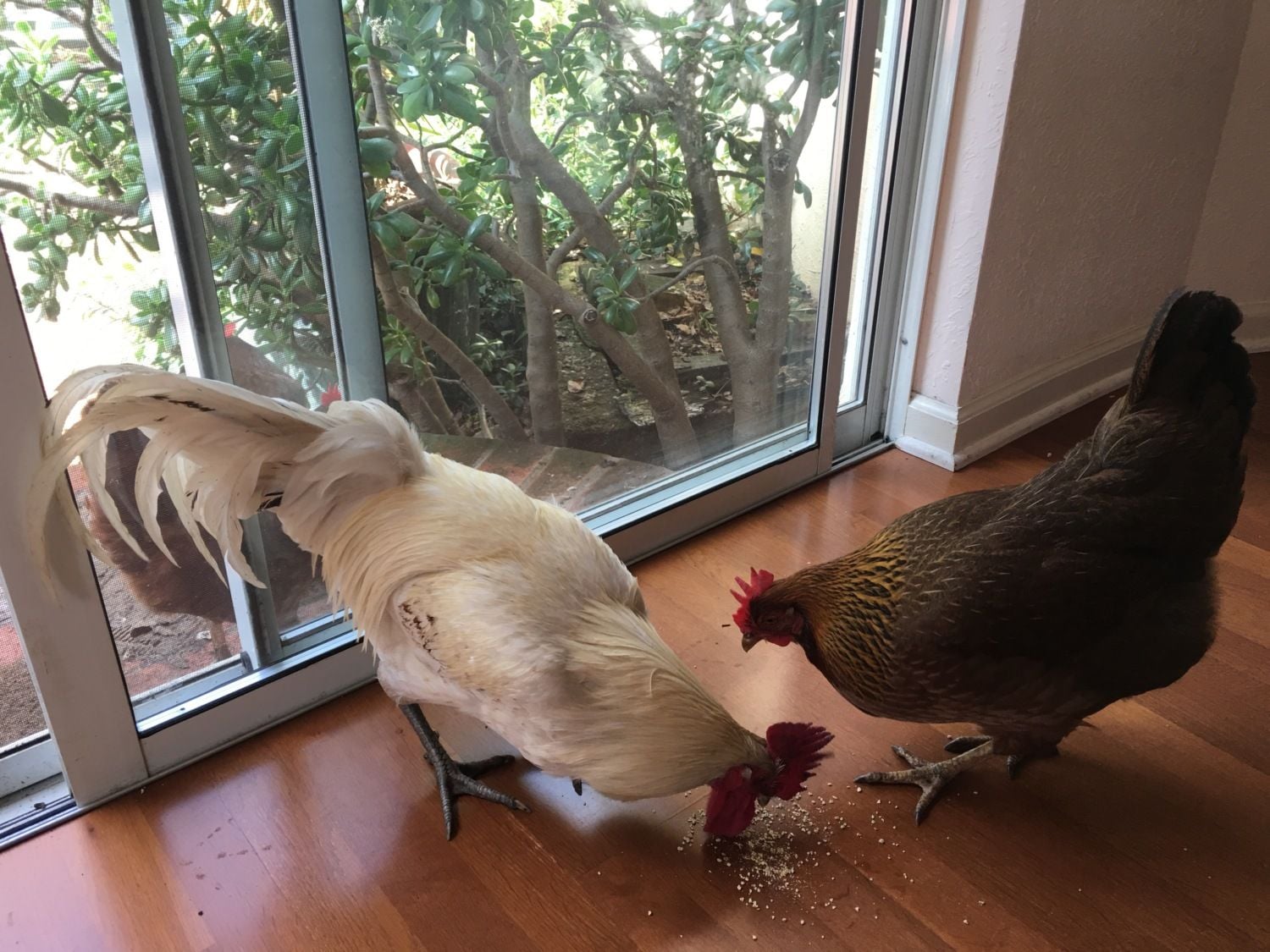 I bought this sweet lady over a year ago - she was a lonely survivor of raccoon attack, owner had no idea what breed it is. She lay around 4 brown eggs a week. Is she a Welsummer? And another mystery - adopted baby chick changed into white rooster - what is it?