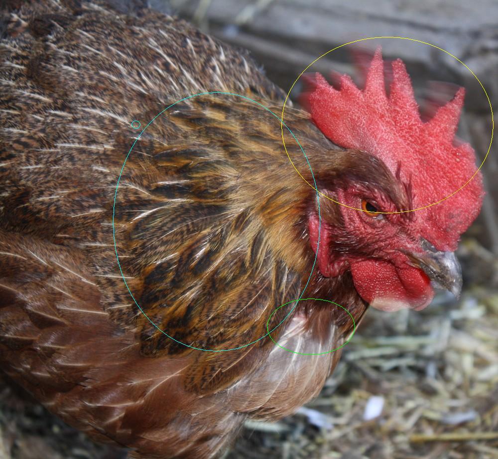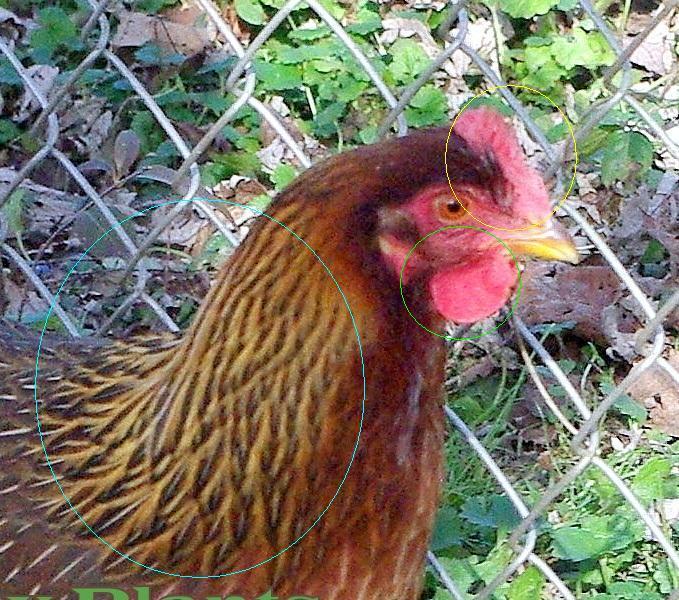 Second is the hackle feathers, circled in green, notice the demarcation where the hackles stop and the partridge pattern feathers start.On your hen, they kind of flow together. Also the pattern of the neck/hackle feathers is not defined on your hen. I circled the wattles on my hen - they are slightly larger than they should be.