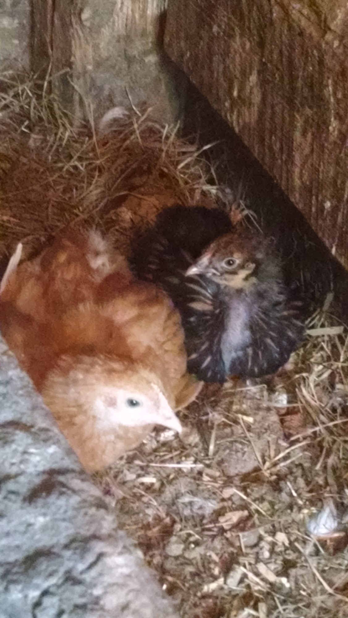 My red Wyandotte pullet nesting next to another baby and my silver Wyandotte pullet checking to see if my phone is a snack