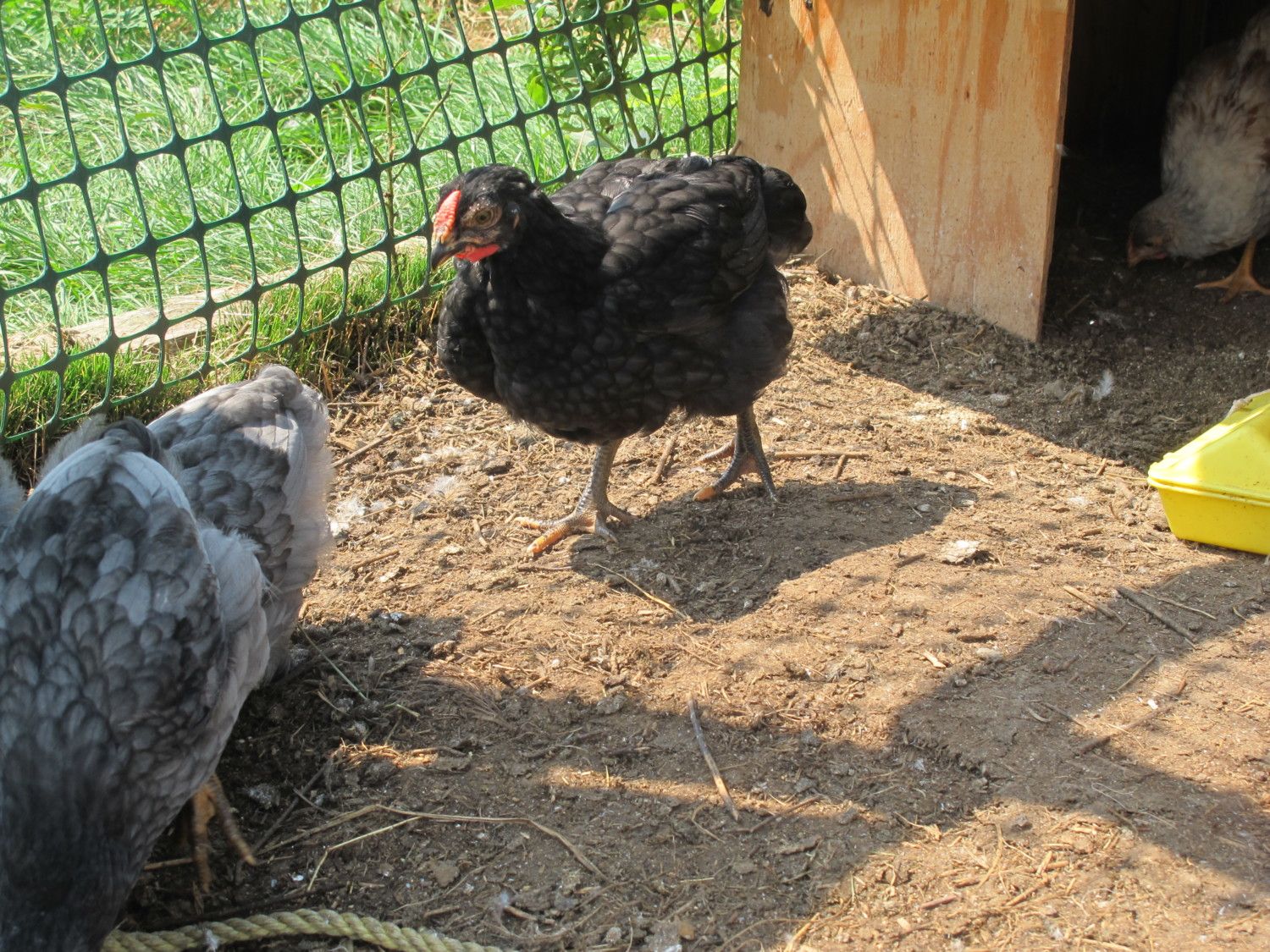 I think I have two roos on the right and a hen on the left based on their combs, my confusion is just that they all seem identical so far in body shape and feathering that feels more pullet-ish. That's what's confusing me. Is there any chance they might all be hens? I can't remember how old they are at this point since we've had chicks coming out our ears.