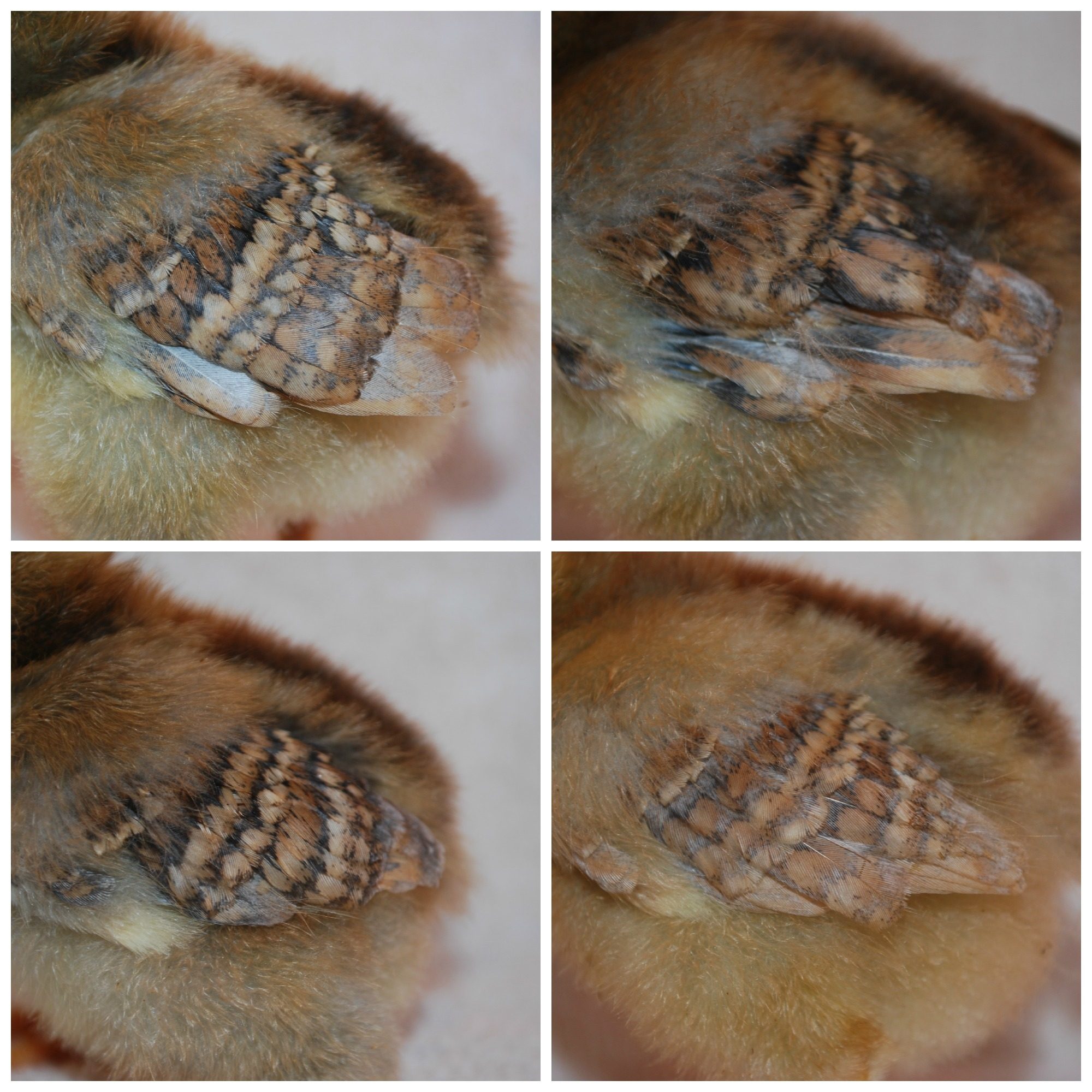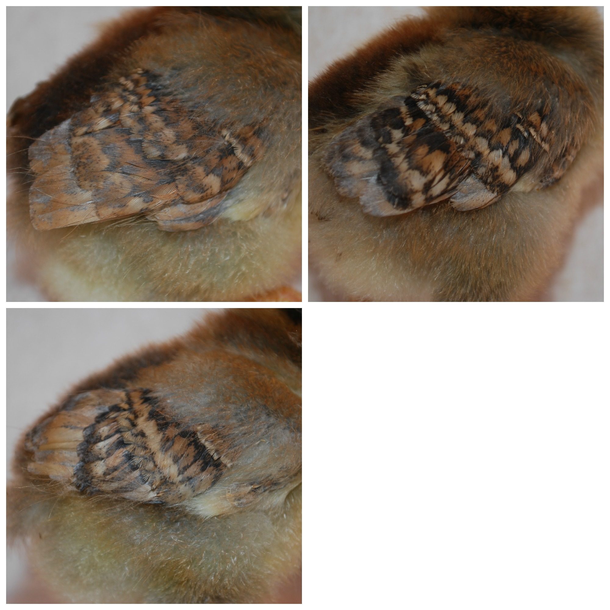 Donna are you on today? I remember you having a theory about the barring on the chicks wings. I took some wing shots of some 7 day olds.