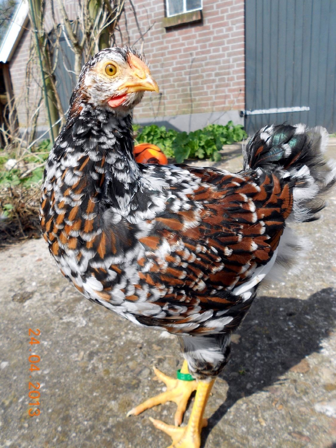 Over the past few years several members have been asking about Tollbunt Wyandottes. Following the recipe given by the Dutch geneticist Sigrid van Dort http://www.chickencolours.com/pagina11.html I started the project to create Tollbunt Wyandotte in 2010, beginning with red mille fleur X black laced red Wyandottes. Now, 3 years later, I’m happy to show some photo’s of one of my Tollbunt Wyandotte cockerels (large fowl, hatched 2/16/2013).
