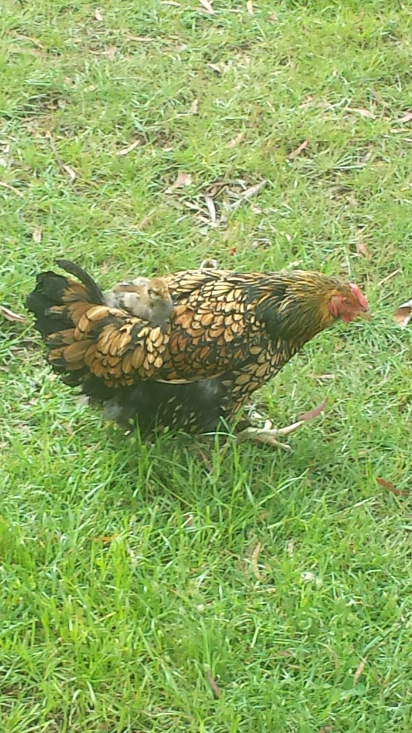 Hi all I'm from Swansea Tasmania Australia. I have a BLGW roo, 2 GLW hens, 1 BLW Hen, 1 BLGW hen, 1 SLW hen and 4 chicks. This is my GLW carrying her chick on her back.