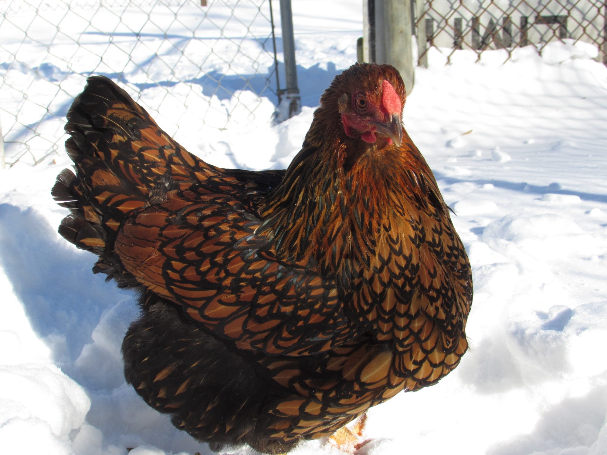 You do not want to use a double breast in Wyandotte breeding programs. Some Judges will also DQ for double breast. If she is double breasted..she is pet quality. I hope it is just the picture and the wind..she is too cute.