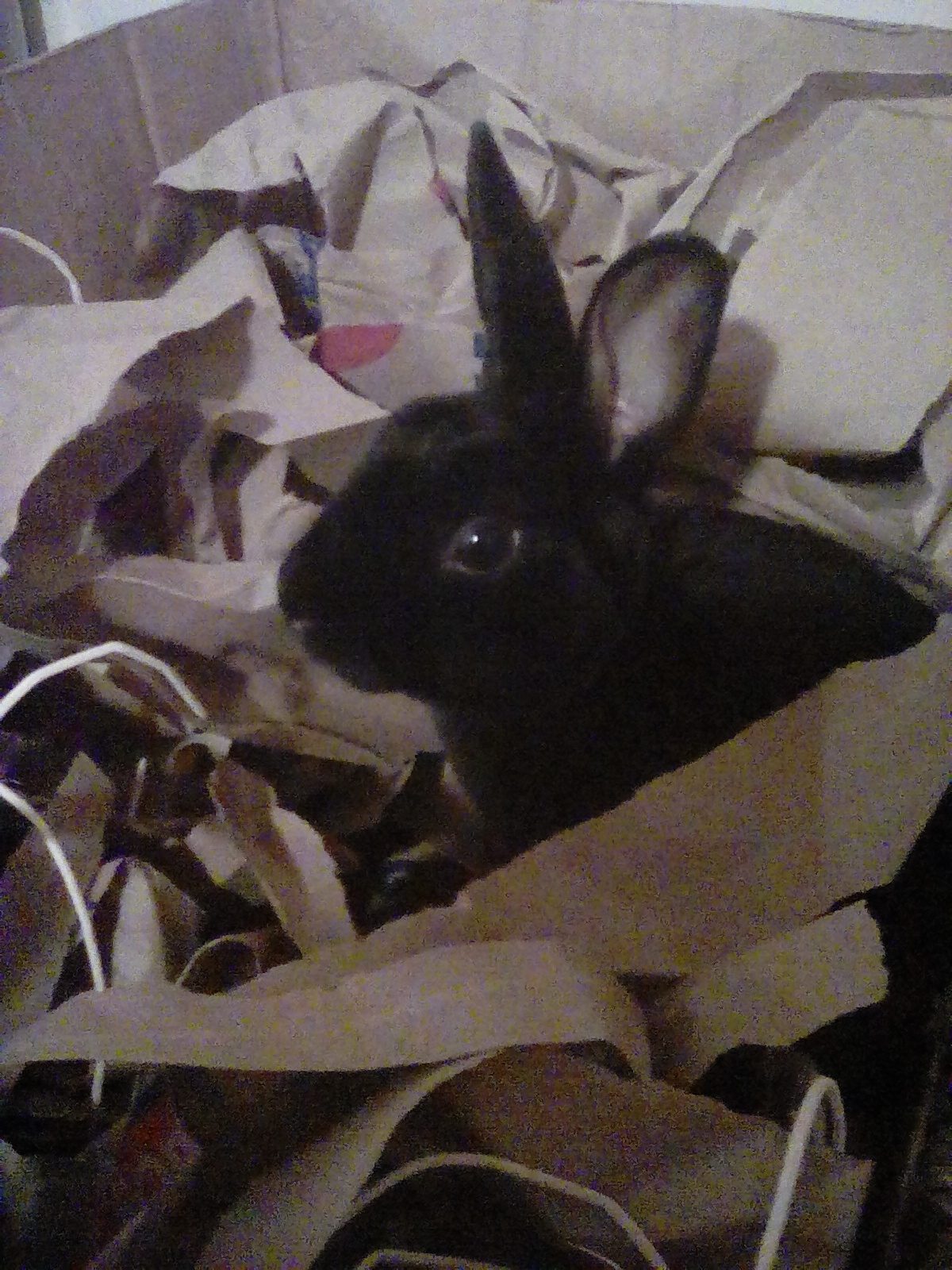 My bunny was playing in his 'burrowing' box (shredded paper bags)