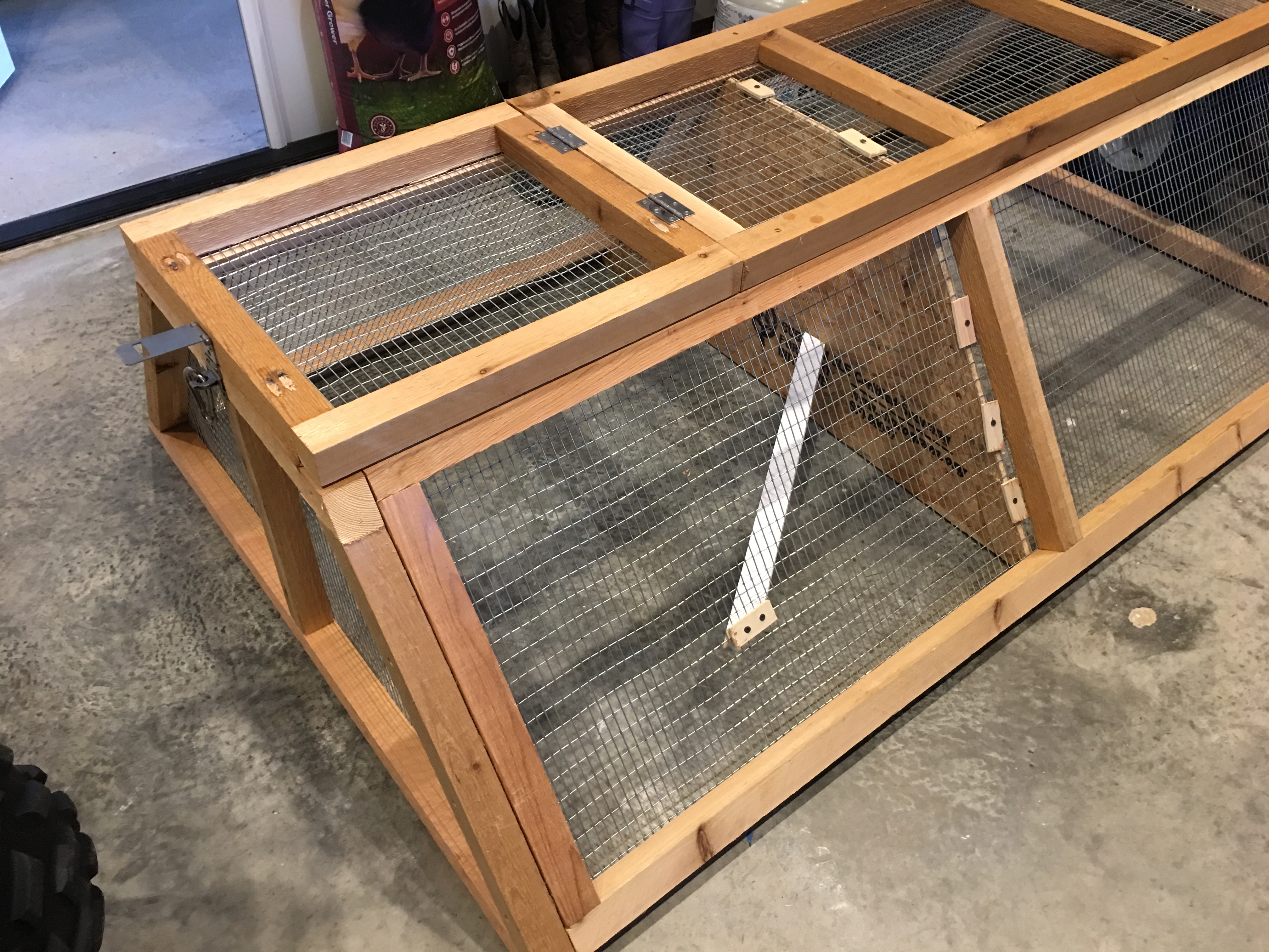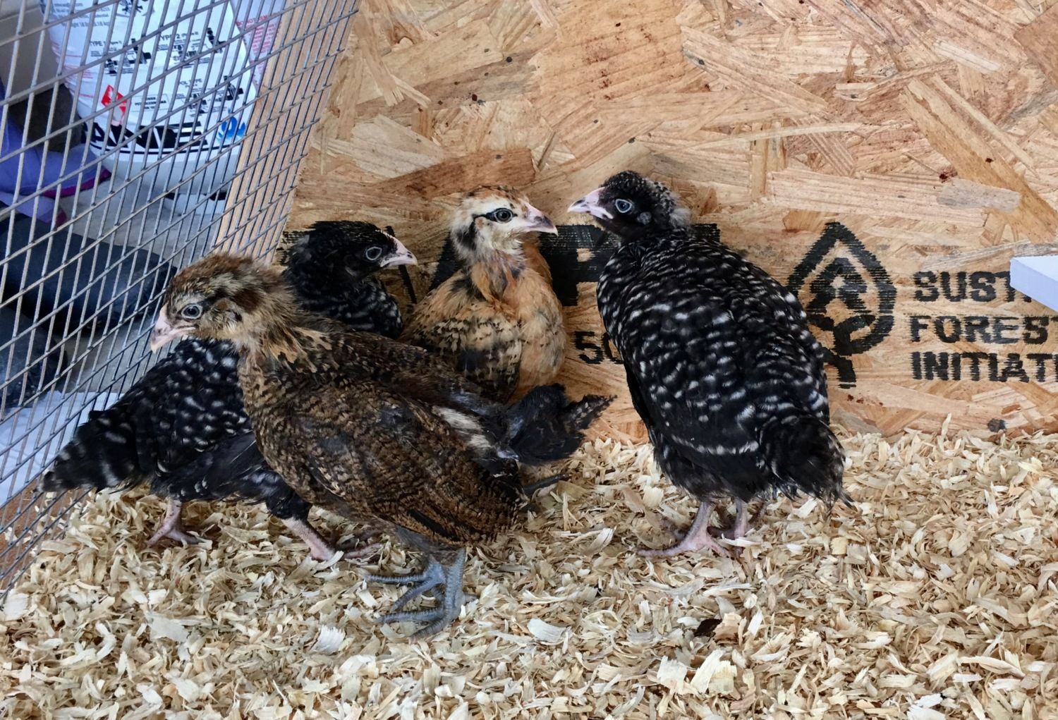 I got the post office call this morning at 7:30 that our 4 chicks were in. 5 week old, 2 each, Easter Eggers and Barred Rocks. I Picked them up and they chirped all the way home. I partitioned the run extension I built, and will keep them there, in the garage, for a couple of weeks before I move them outside. I put cardboard and 3" on pine shavings under the pen. They were hungry. I took them out one by one. Put each of their beaks to the waterer while I touched it so the water would run over their beaks slightly. They weren't interested in that. Each one made a beeline for the food dish. I was there for 10 minutes and they never left the food dish.