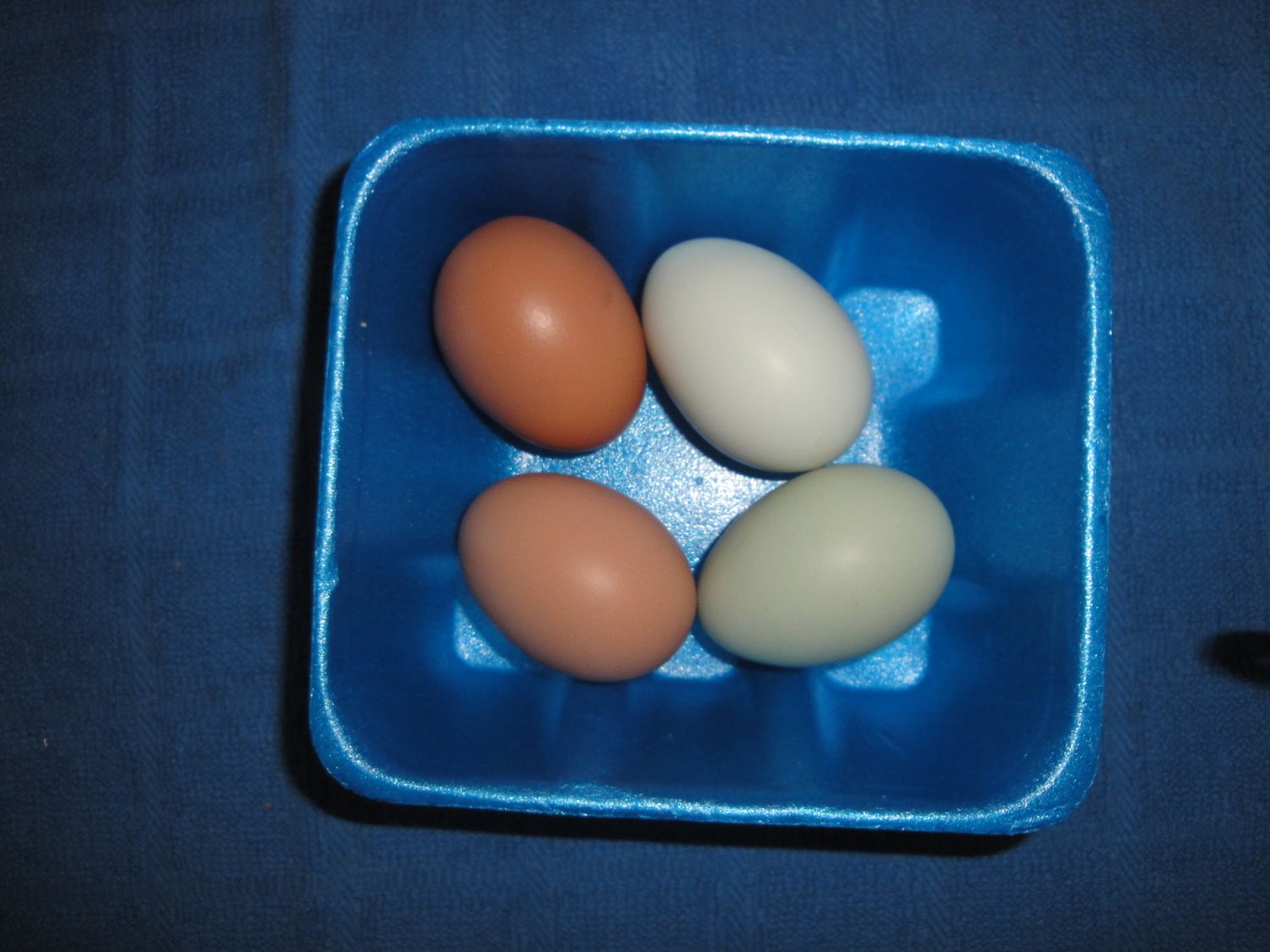 I bought what I thought were Ameraucanas (hatchery) which BYC readers informed me were EEs. They do lay greenish colored eggs and are so very entertaining! One EE lays a darker green/blue egg than the other (although looks white in the first pic), my 2 RIR lay different shades too so I know who lays when. They just started laying, getting 4 a day!!!!