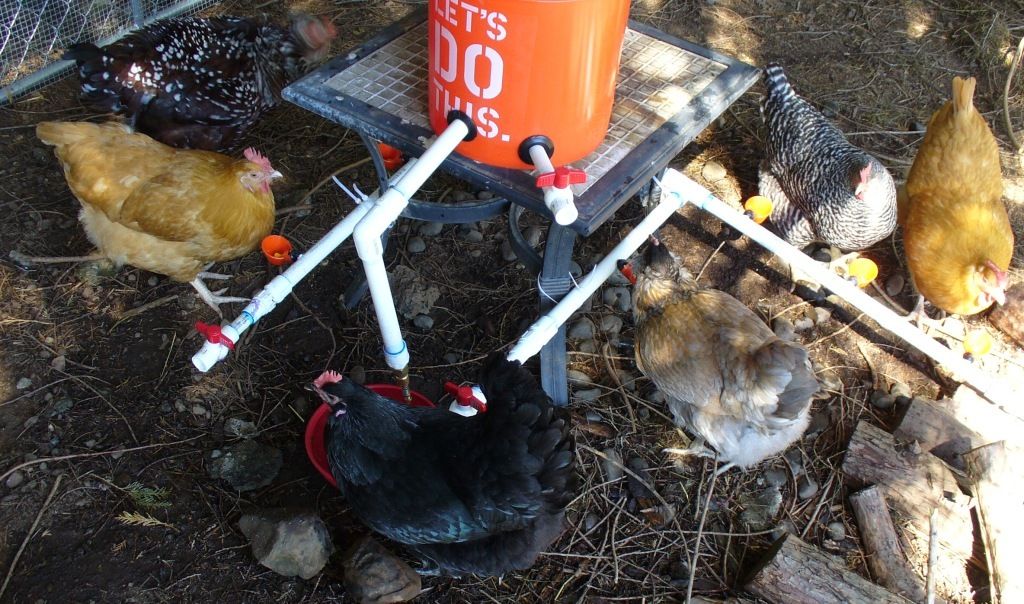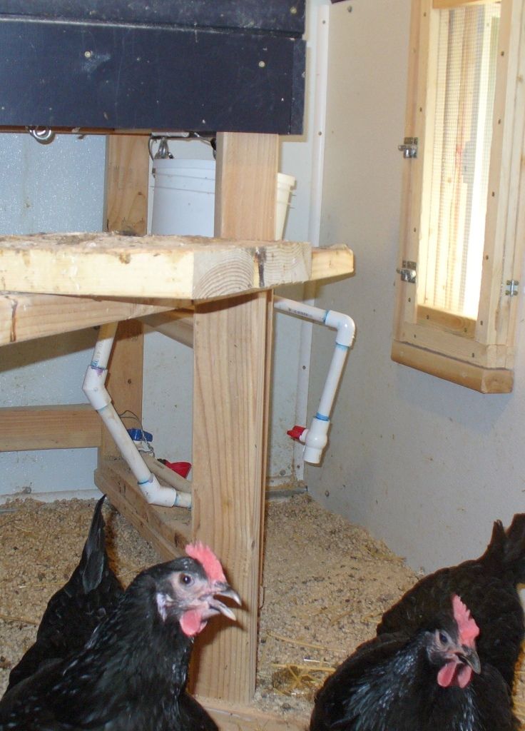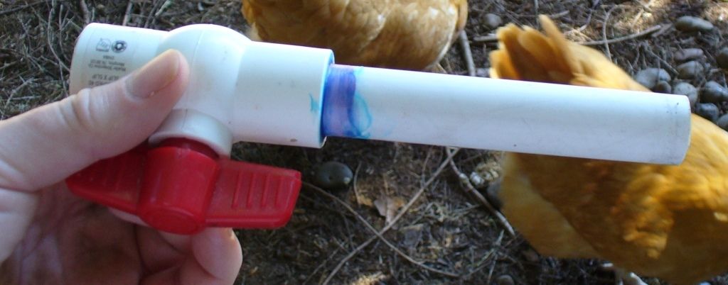 Today I wanted to drain out the warm coop water and replace it with cool fresh water. It didn't have a drain so I went through the whole dance with an almost full bucket- getting the lid off without damaging the other PVC work that is glued- well, now it has a drain. Having a 2nd Uniseal with the above described set-up gives means to flush the bucket in seconds and refill with clean water. Another wonderful place to have a drain is at the end of each PVC pipe line of poultry cups and/or nipples. Overkill? Maybe, but for that one-time $3 expense, I can flush the pipe quickly and often- good way to keep things clean. In places where water conservation is especially vital, having control of the discarded water makes it easy to reuse in the landscape or garden.