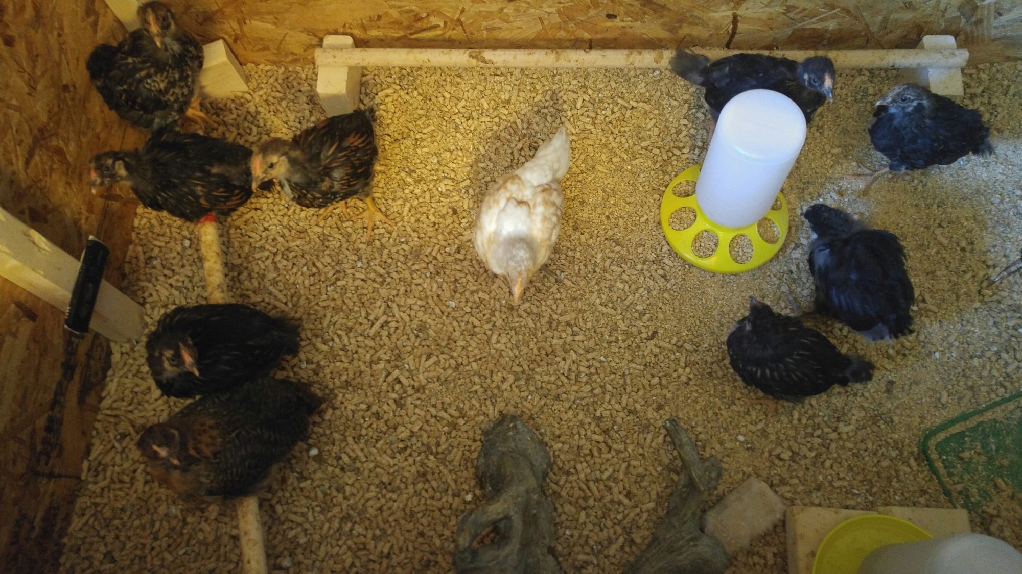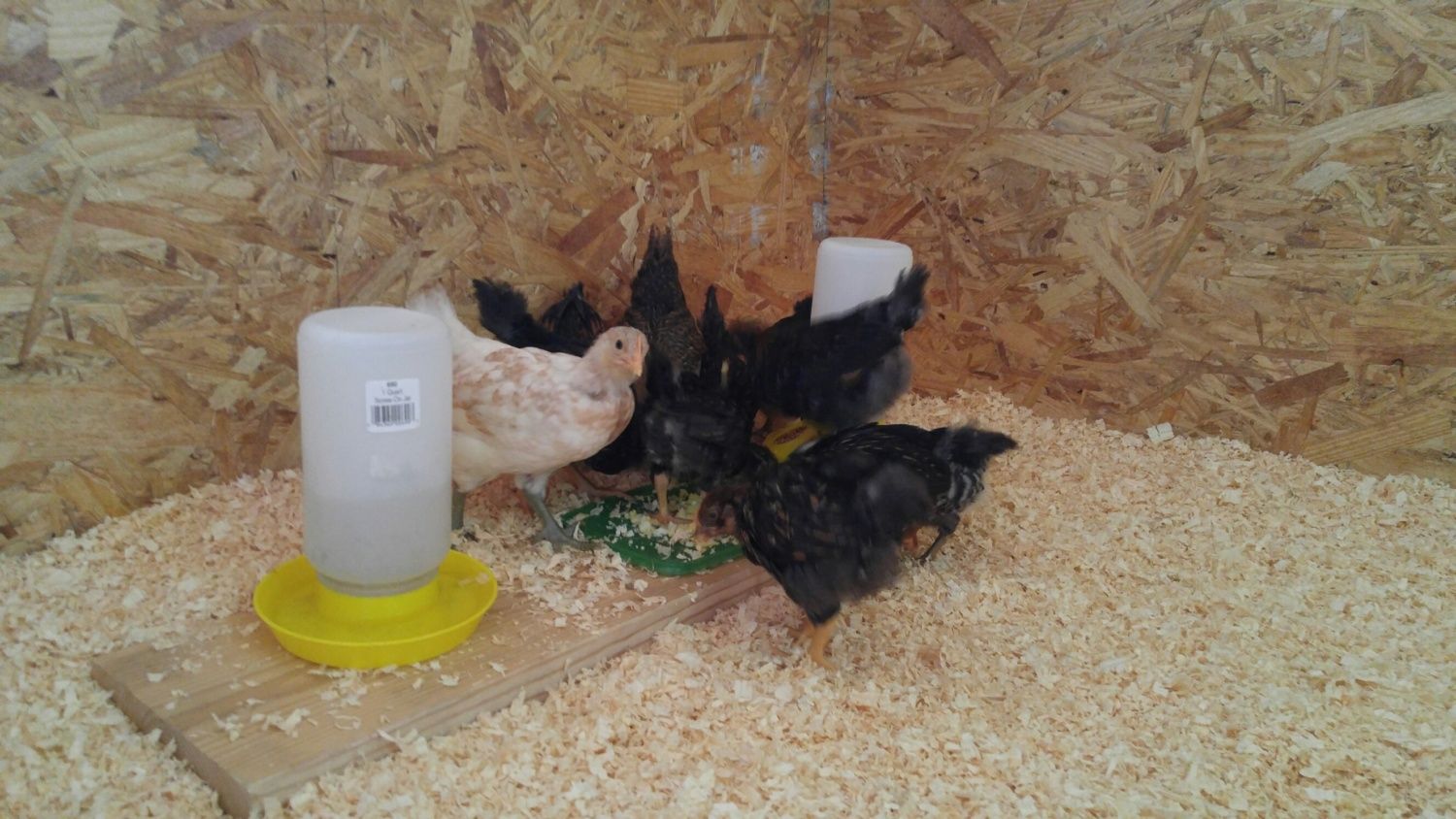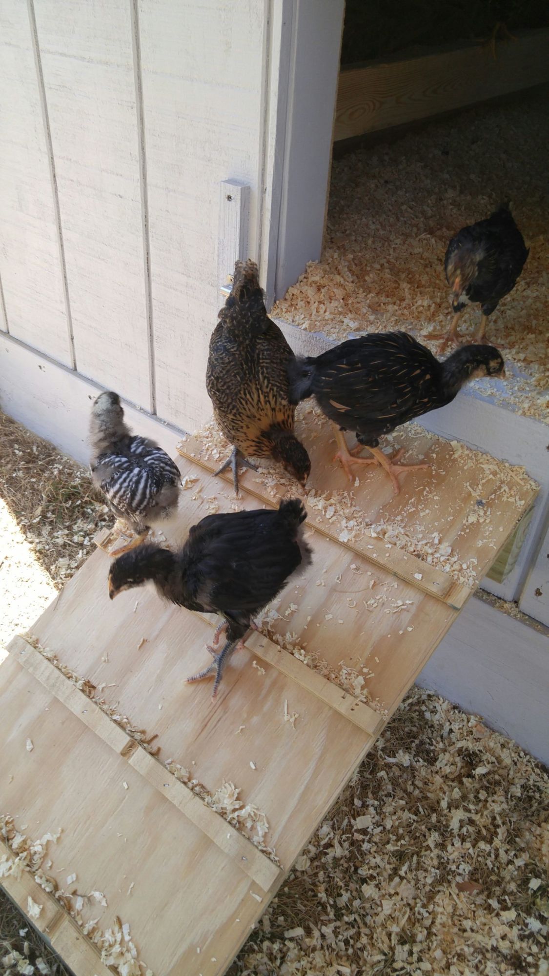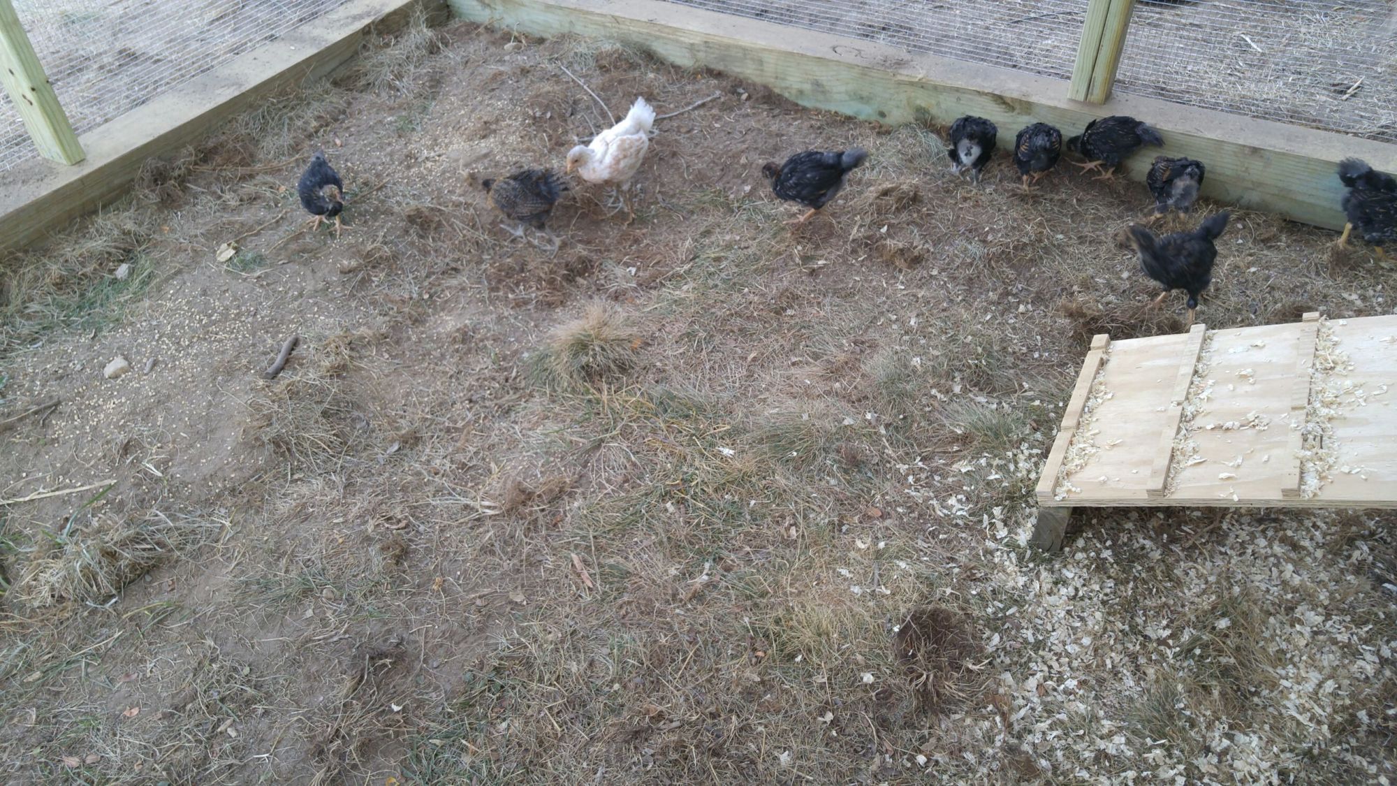 I think we've reached the point where the girls need to move outside! They are 4 weeks old today and they are getting too big and too active for the brooder! All but one of them have a good amount of feathers, with some down feathers still left - mostly around the head. They are all close to pigeon size now. We were going to move them outside this morning, but the temps tonight might dip into high 50's. The nightly temps the rest of the week should stay in the mid to high 60s. We are going to move the heat lamp out into the coop just in case, but we were nervous about the 50s....