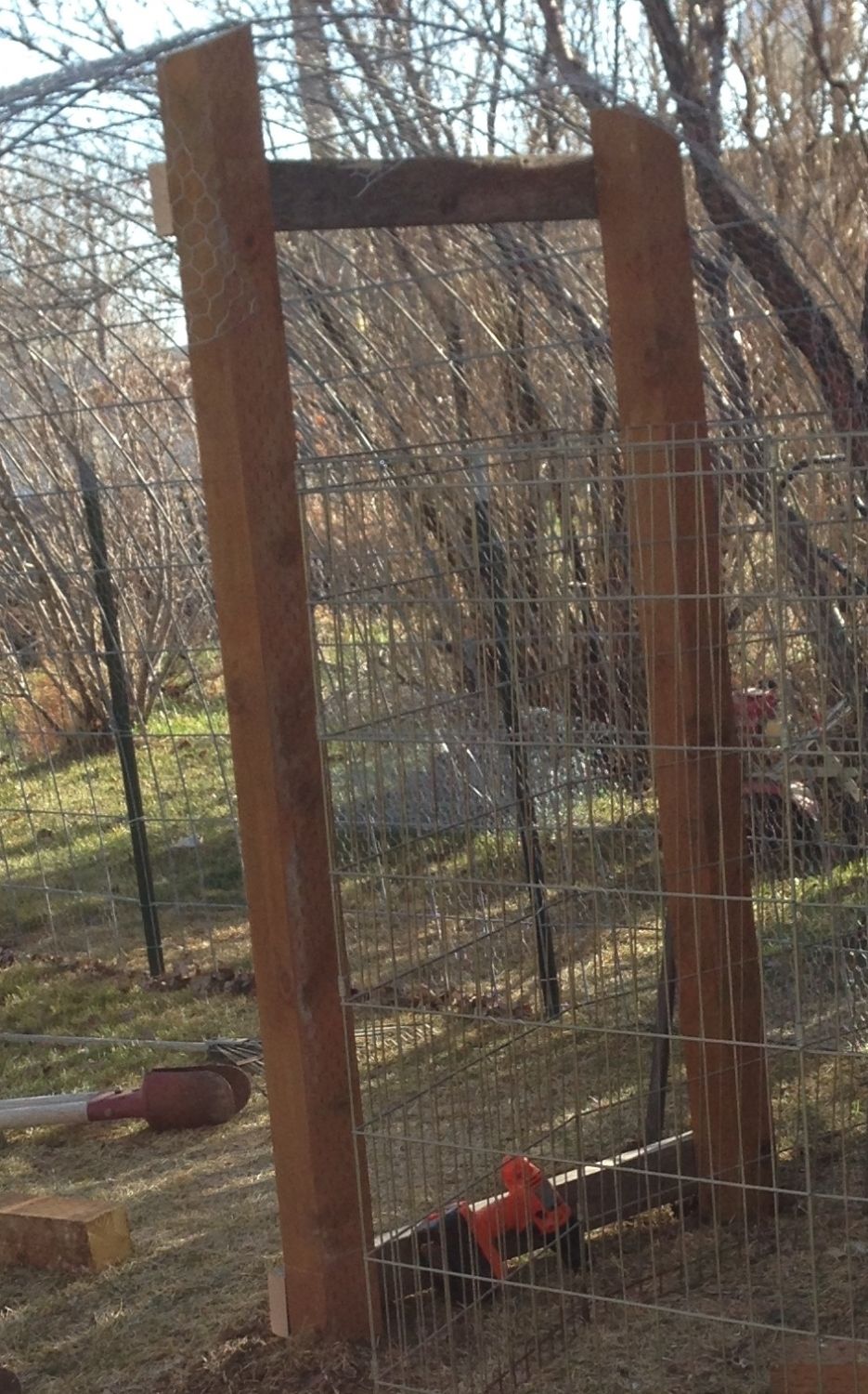 going to sink a wooden post in the ground, use 2X4 runner top and bottom, run corrugated metal on the bottom, then have the hoop of cattle panels steeple to the top runner.