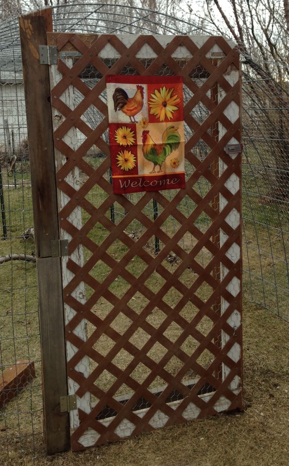 Then he built a simple frame of scrap lumber and we screwed some old vinyl lattice we had laying around from another project for the door. Ugly, but effective. It's held up very well...no problems with the door, the door framing, or the attachment to the cattle panels - it's all as strong today as it was when we built it. Here you can also see that we used some welded wire fencing between the door frame and the edge of the run, and we did the same thing on the pop door side. It is sandwiched between the frame pieces and then wired to the top edge of the arch in the cattle panel. It was easy to cut a hole in that to give the chickens access to the tunnel and coop. Where we cut it to fit over the tunnel, we just laid the length we cut on top of the tunnel and screwed it into place with heavy, large washers and screws. Again, no issues - it's held up quite well.