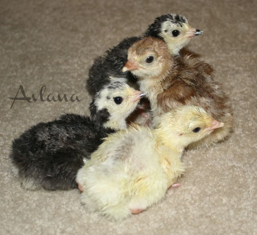 And here are 4 of my poults. I've had another poult who just hatched, that's not in the pictures. And I have three turkey eggs left in the incubator with two of them having external pips. Just waiting on them. I have two black spanish poults( from ebay), two marked sweetgrass? and a mix who isn't shown yet (Arielle's eggs). I'll get more pics once they're finished up hatching.
